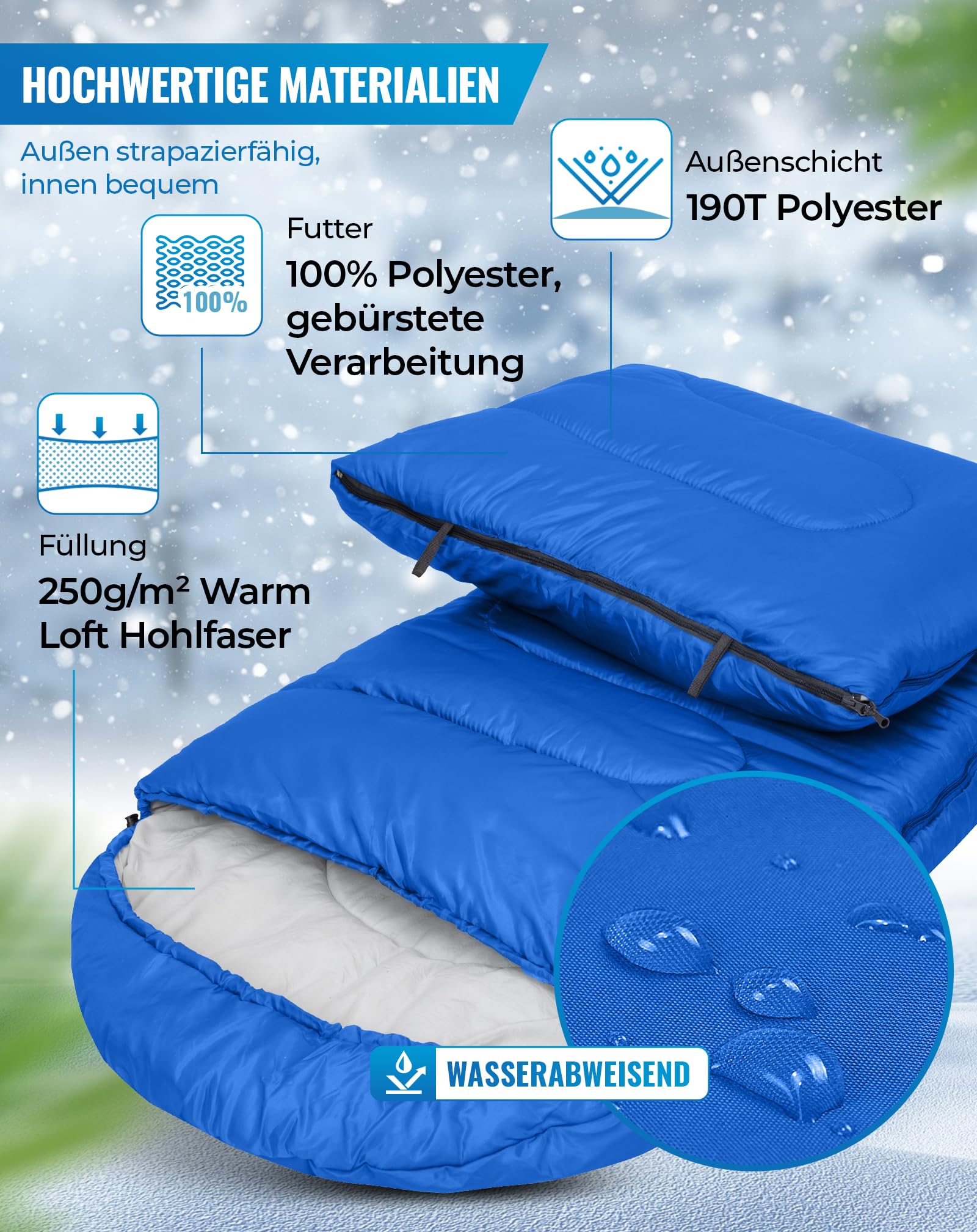"COMFORTABLE & ROBUST: The outer material is made of durable and water-repellent 190T Polyester W/P Cire. The soft inner lining made of 100% Polyester 70g/m2 is super comfortable. Warm filling of Comfort Loft 250g/m2 ensures use for 3 seasons. You can unzip the sleeping bag widely and use it as a blanket.