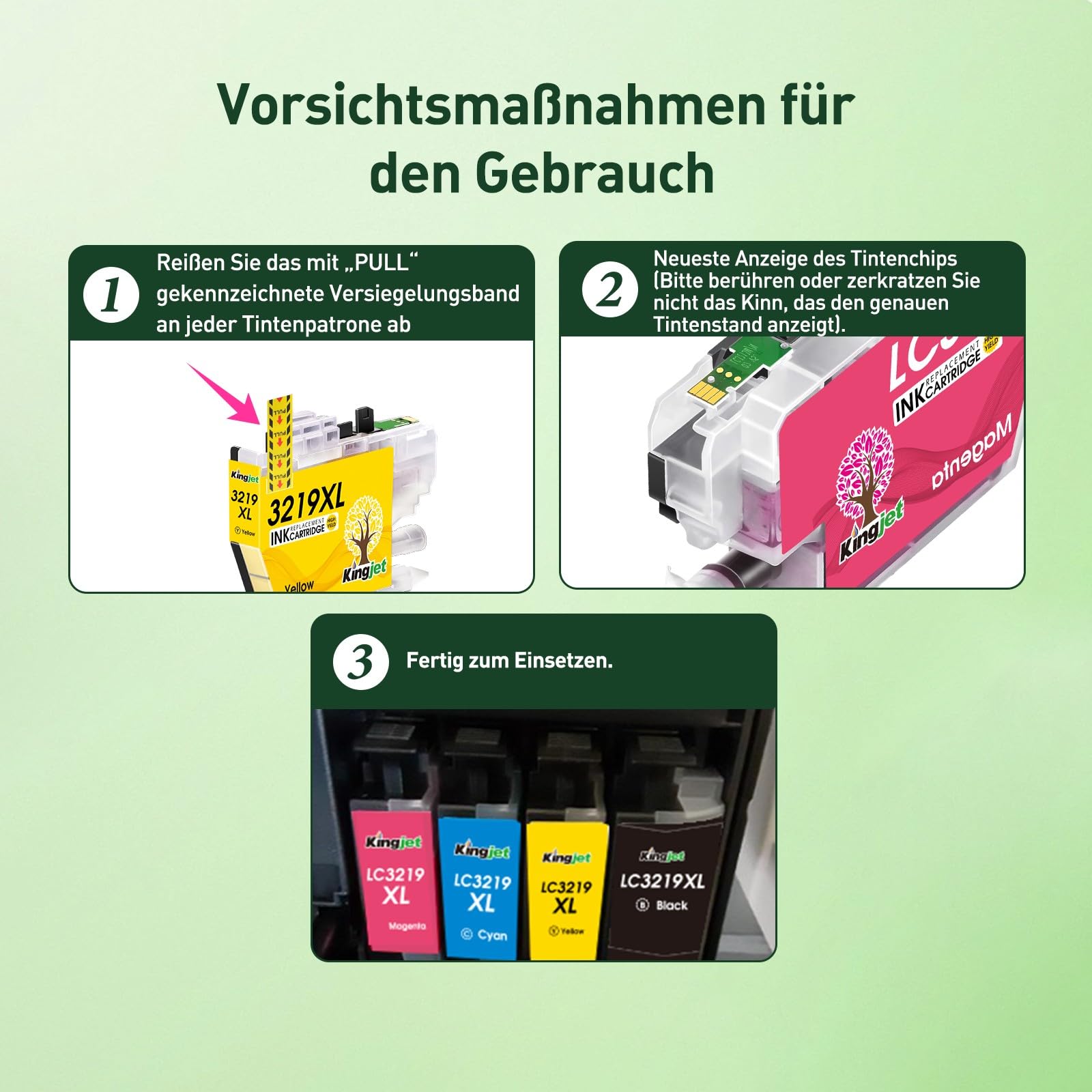 "Print with Confidence: Each Kingjet LC3219XL ink cartridge is fully tested before shipping. Individually vacuum sealed, with multiple protection devices ensuring safety during transport"