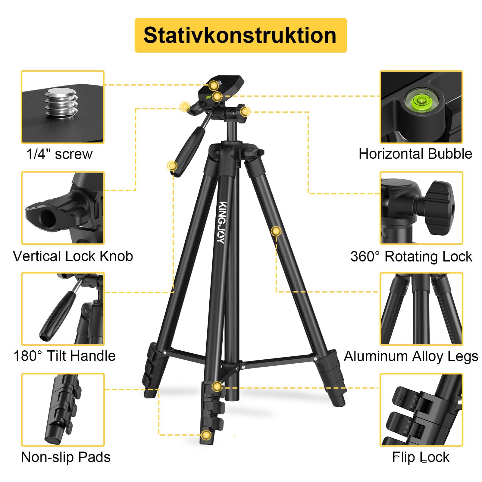 "【Adjustable & Stable Tripod】The KINGJOY smartphone tripod features a double, triangular reinforced design and is made of high-quality aluminum tubes for high stability.",