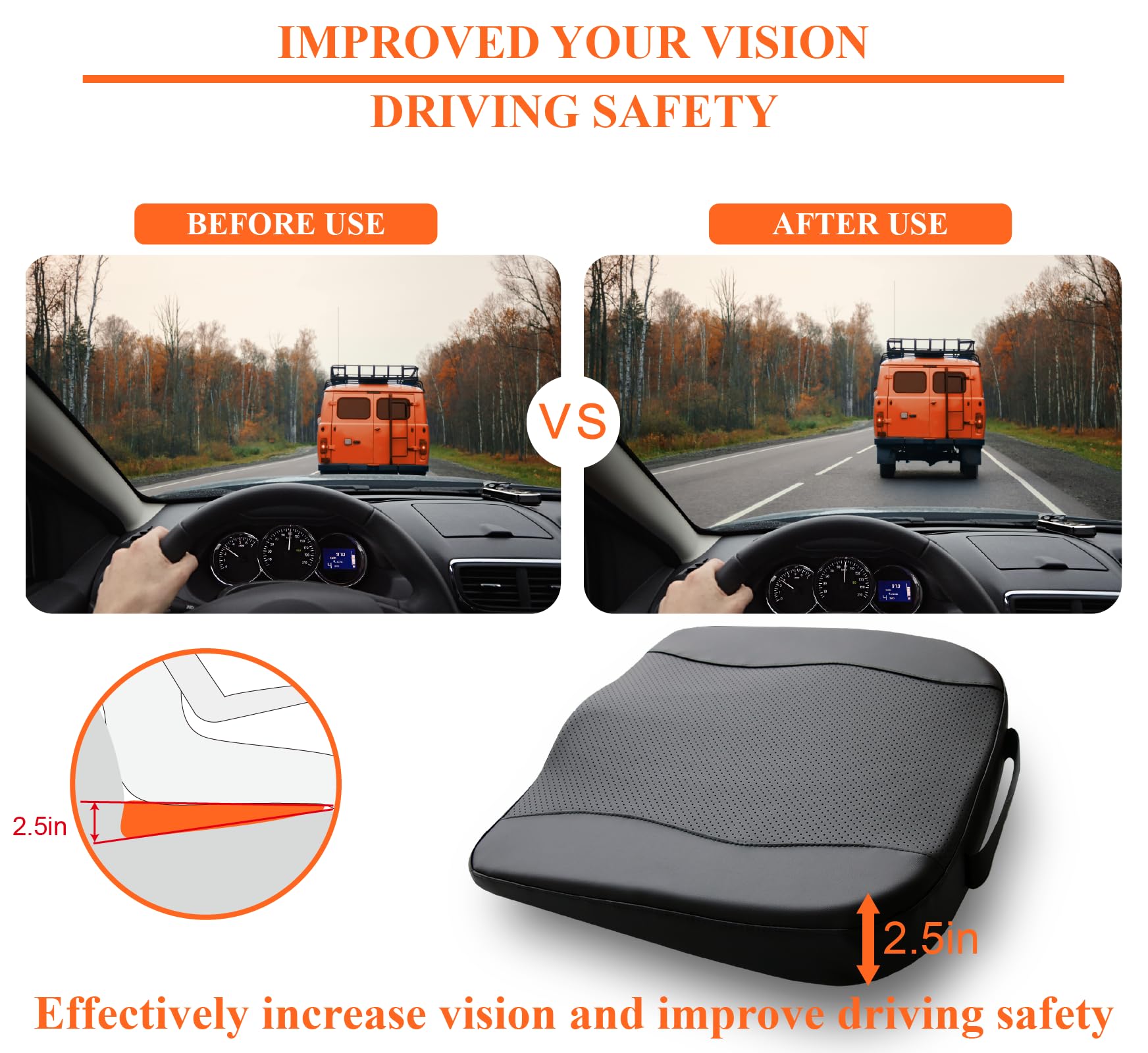 IMPROVED DRIVER'S VIEW: The seat height is raised by 2.5 inches, enhancing visibility while driving. Our car seat cushions help drivers see the road clearer, promote proper posture, and healthy spine alignment. The cushion is ideal for smaller individuals to improve driving position. The non-slip bottom ensures the seat cushion stays securely in place.