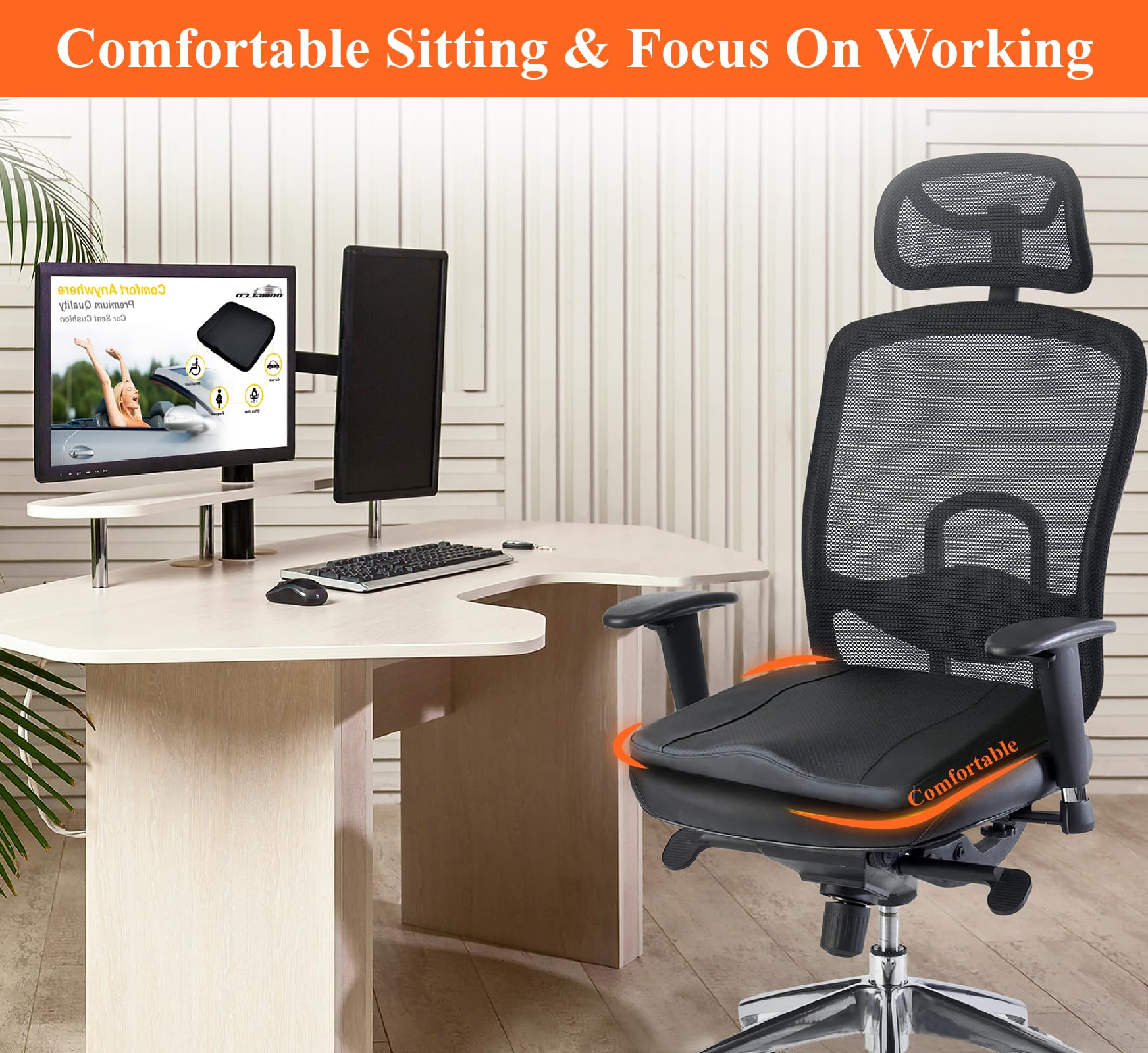 "RELIEVE BACK PAIN: Prolonged sitting or driving can lead to back pain and discomfort. Our comfortable car seat cushion effectively relieves pain in the lower back, coccyx, and sciatic nerves, allowing you to enjoy longer drives in a more relaxed manner.