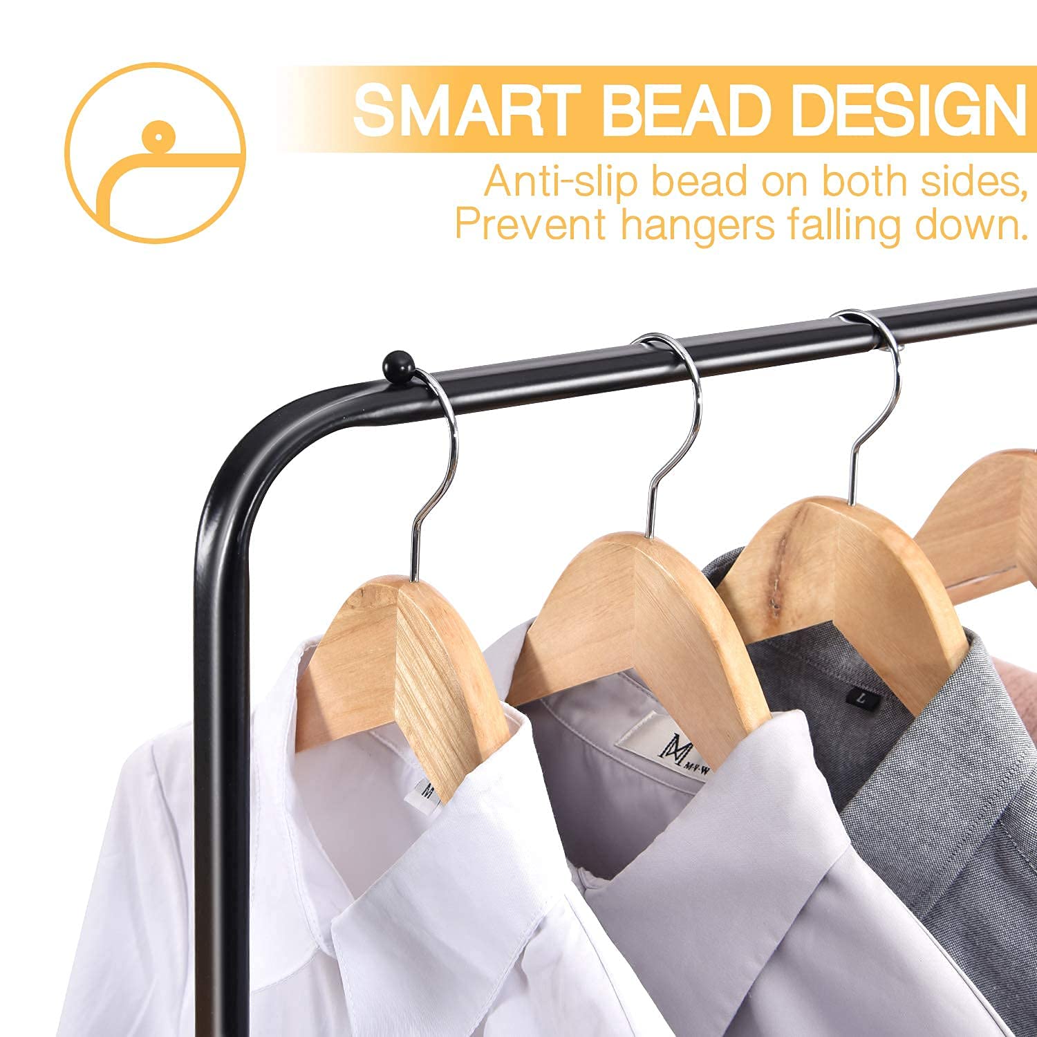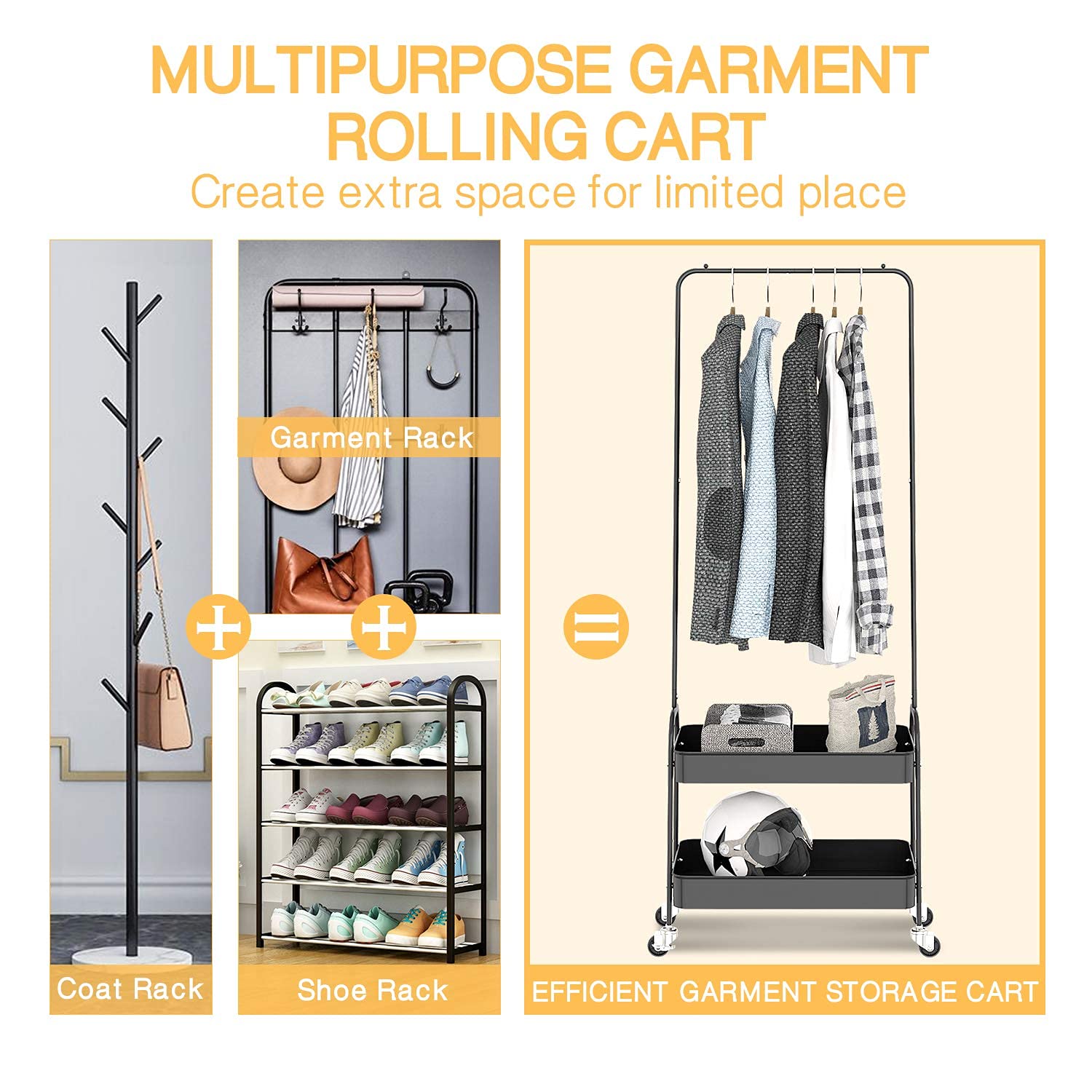 ["Sturdy material"] This portable clothes rack is made of thickened high-quality metal tubes coated with powder, which is rust-free and durable. The trolley structure of the clothes rack is durable for better load capacity.