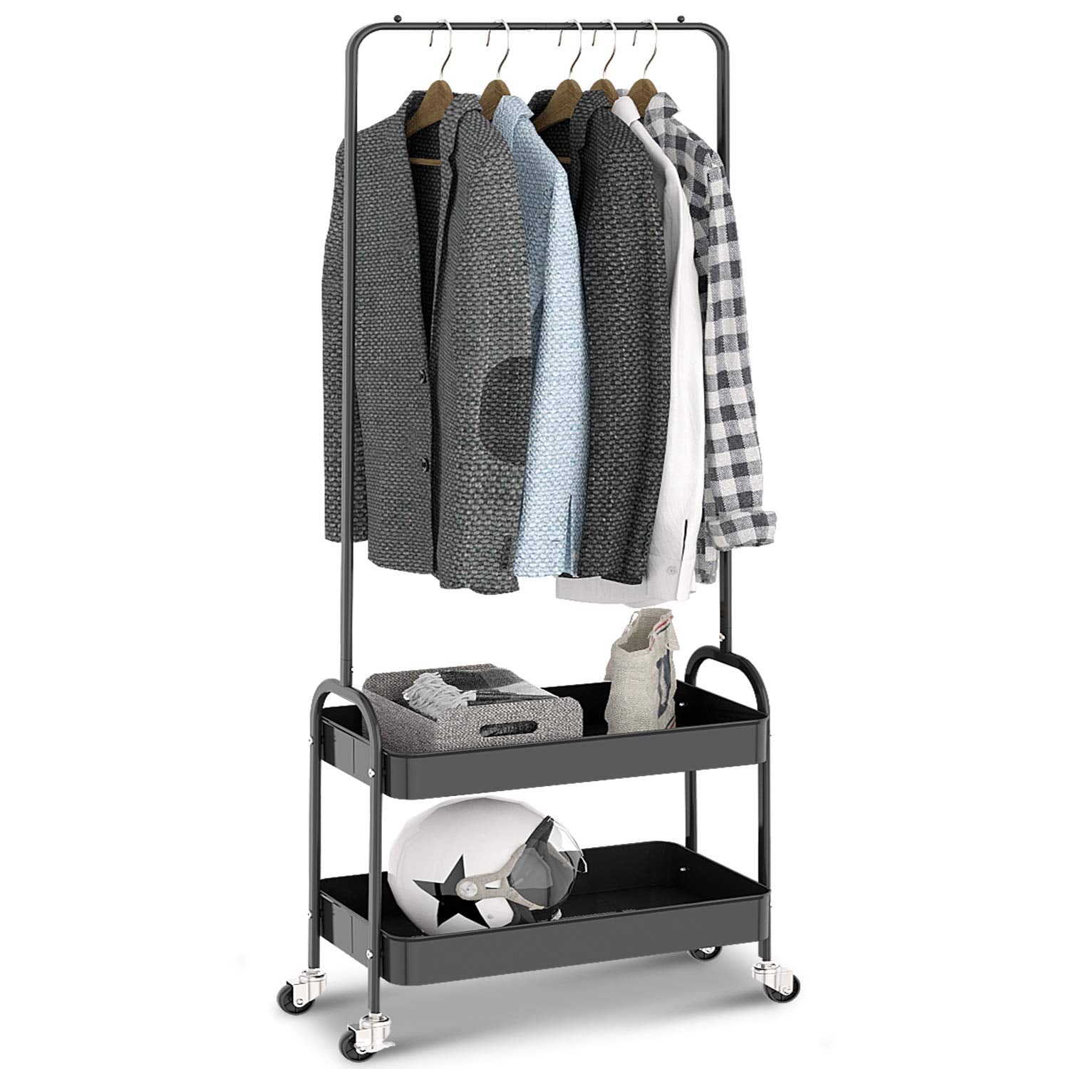 Kingrack clothes rail, metal coat rack, clothes rail with wheels, bedroom clothes stand, freestanding shelf cart with 2-tier storage shelf, heavy duty trolley multipurpose cart in black.
