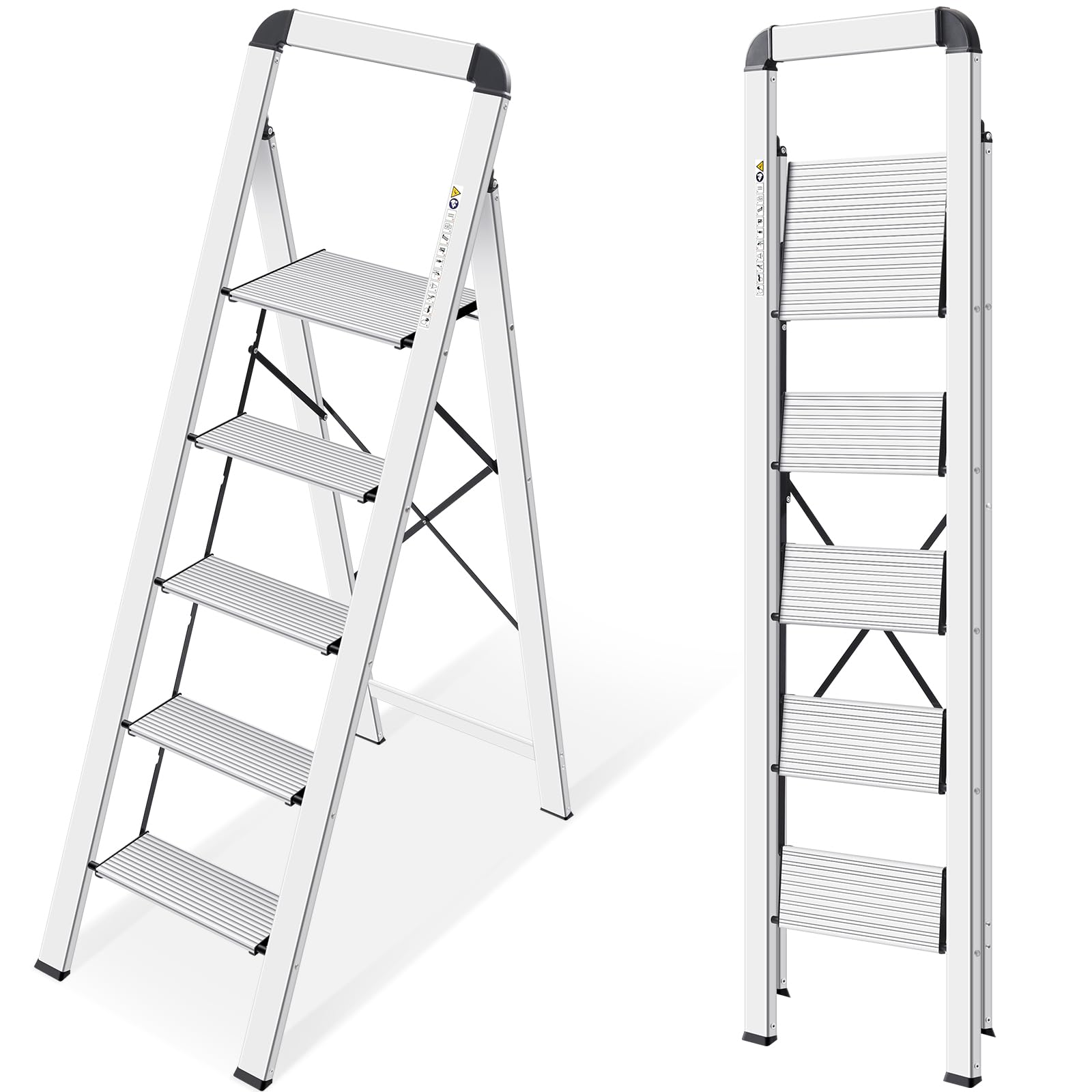 ["【5-Step Lightweight Ladder】: KINGRACK ladder adopts aviation-grade aluminum alloy material, weighing only 16.31 lbs, much lighter than others, the special aluminum material makes it anti-rust, anti-corrosion, anti-scratch, extending the ladder's lifespan.","【Safety Lock & Sturdy Structure】: The step stool has a perfect triangular frame structure and the cross metal support frame design on both sides, which can reinforce the support of the steps, making the ladder structure more complete and secure. The safety buckle design is located at the bottom of the top steps, which can make the top steps more stable and not wobbly when in use.","【Anti-Slip Design】: The pedal surface of this 5-step ladder features a horizontal pattern, perpendicular to the soles' grain, and the foot covers have full rubber non-slip patterns, this design perfect for non-slip protection and wear-resistant.","【4.6 cm after Folding】: The size of this ladder meets the usage requirements of most families, the ladder is only 4.6 cm wide after folding, making it ideal for storage in the corner or under the sofa, etc., easy to store and reduce storage space, open size: 44.5*88.4*137 cm, folded size: 44.5*4.6*147.8 cm.","【Versatile】: This step stool is very lightweight, easily movable to any location, versatile for a variety of applications, such as painting, cleaning, or using as a child's seat, and you can use it to be a decorative ladder, like a bookshelf, a flower stand, a library ladder, etc."]