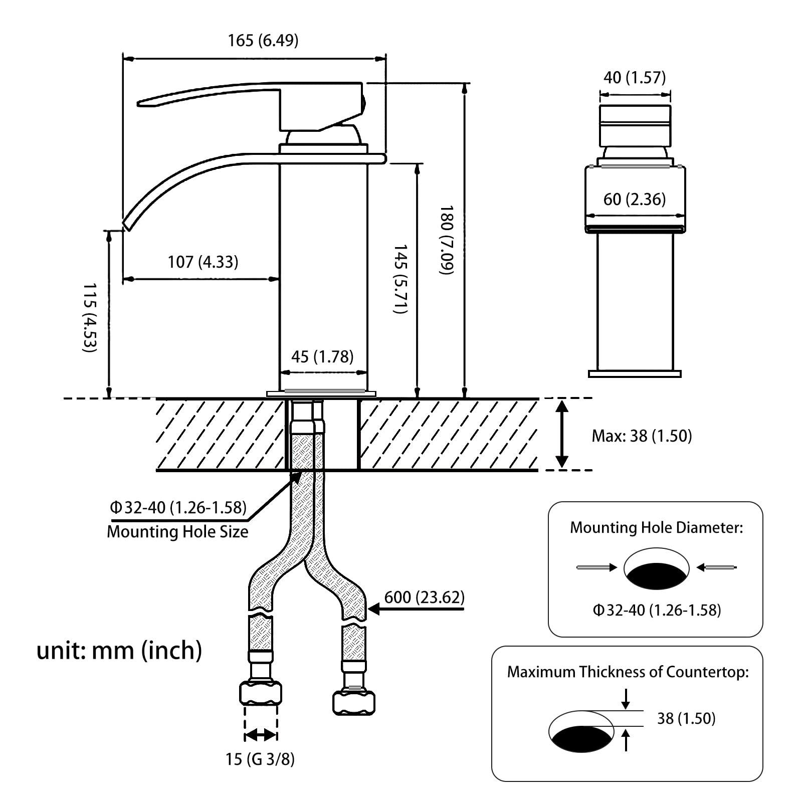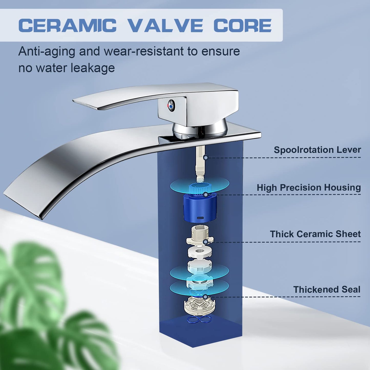 ["✦ EASY INSTALLATION: Standard G 3/8\" Hot and Cold water hoses, instruction manual included, the installation process is easy, No plumber required, save money!","✦ BATHROOM FAUCET WATERFALL: This chrome waterfall faucet features an ultra-thin waterfall spout, showcasing modern aesthetics. The soft water outlet displays the beauty of nature, listen to the sound of natural waterfalls. Ideal for various bathroom styles.","✦ SOLID BRASS: The waterfall sink faucet is made of lead-free H59 solid brass, with the surface treated with PVD electroplating technology, corrosion and rust resistant and long-lasting. Thanks to advanced chrome plating technology, the products always maintain a new shine.","✦ WATER SAVING: The bathroom waterfall faucet has a built-in ceramic valve core that has been tested multiple times – drip-free, antioxidant, heat-resistant, aging-resistant, and durable. Waterfall spout – no splashing, easily save 30% water!","✦ EASY TO USE: Bathroom sink waterfall faucet with obvious hot and cold labels, easy adjustment of desired water temperature. Dive into the fun of washing!"]