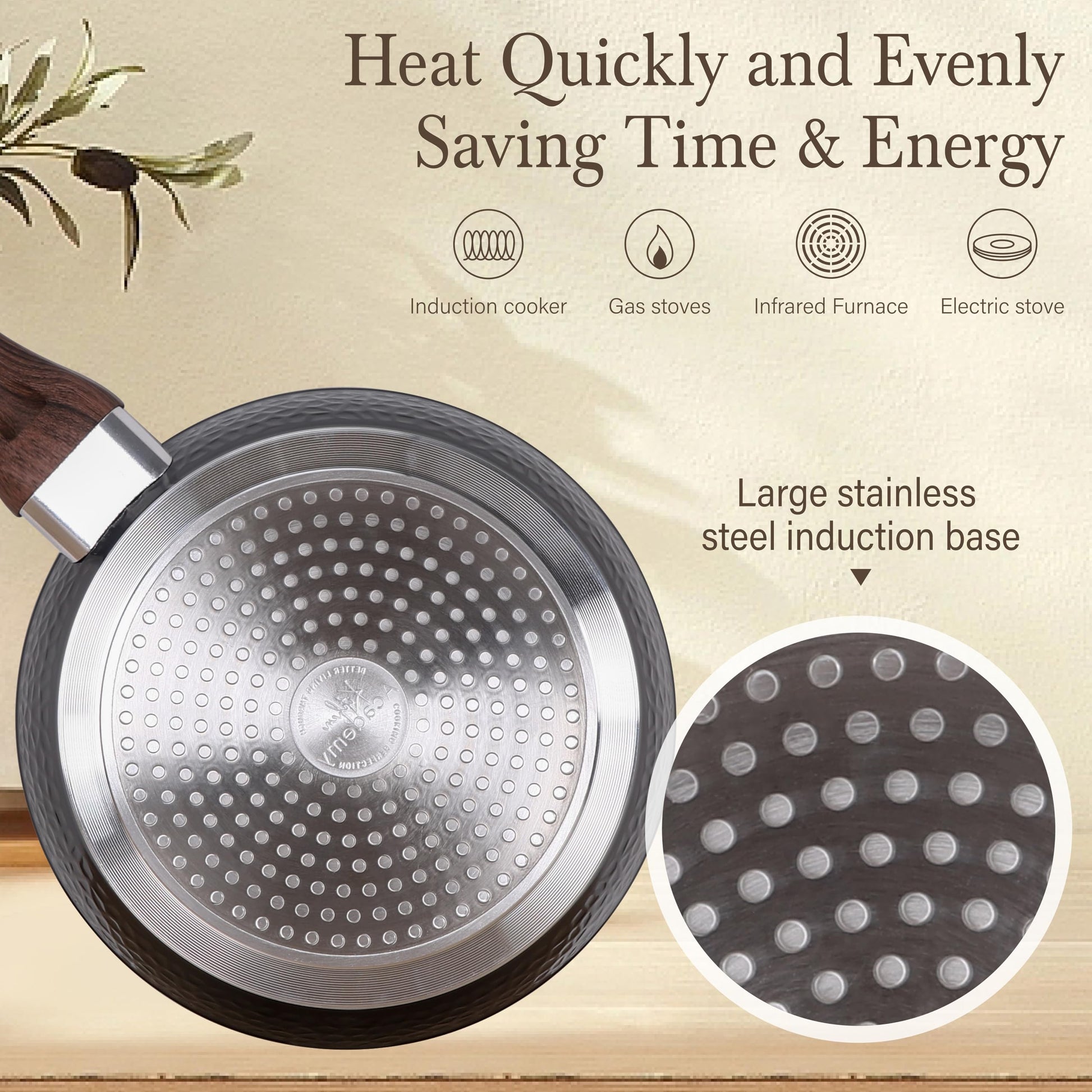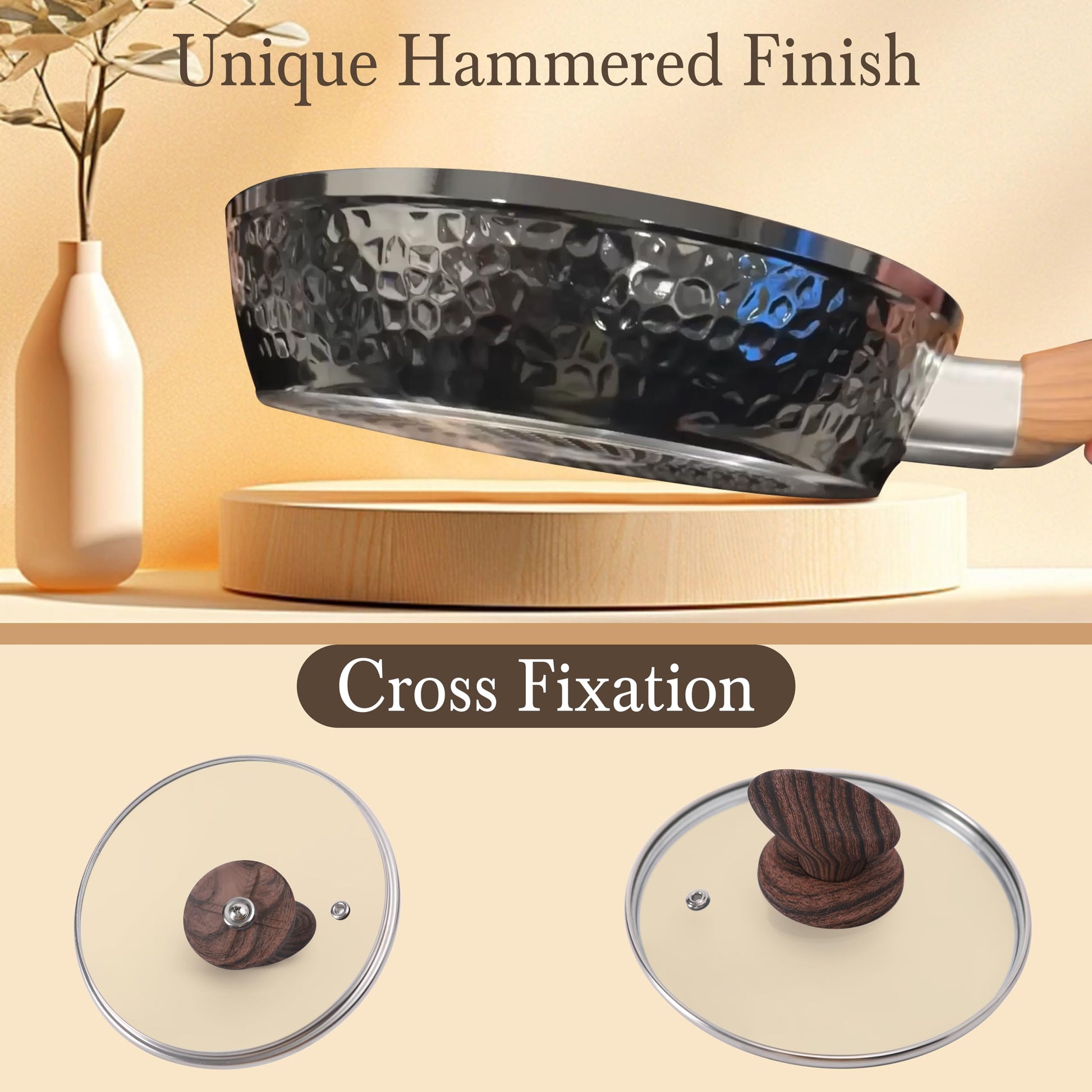["π₯ Kitchen Cookware Set 12-piece - including 8-inch skillet / 11-inch skillet / 1.5 Qt saucepan with lid / 3 Qt wok with lid / 3 Qt casserole with lid / 5 Qt casserole with lid / 2 piece silicone utensil set. Easy to clean and hand wash recommended","π₯ Classic 5-layer construction and visual control - the non-stick pots and pans set is based on a 5-layer coating, thick aluminum core for fast and even heat distribution. The tempered glass lid and heat environment technology help to seal in the natural juices and nutrients of food, helping to retain moisture and flavor. You can monitor the cooking process at any time with a transparent glass cover and effectively prevent spills.","π₯ NON-TOXIN COOKWARE SET - When purchasing a new set, make sure it clearly indicates that it is lead, PFOS/PFOA-free. These are the three things you do not want in your cookware due to their potential health hazards. Fortunately, you can get granite cookware that is free of these harmful chemicals. For more health & eco-friendly benefits.","π₯ Exquisite hammered design - Tired of boring cooking? Kitchen Academy cookware sets designed with hammered finish, enhance the artistic sense of the kitchen, when you use these pots and pans, you are more in the mood to prepare every meal. Ideal housewarming gift, Christmas gift, etc. for family and friends.","π₯ Compatible with all surface inductions - the stainless steel base with ultra strength and durability, compatible with all stove types including induction, gas, electric, halogen, glass, and ceramic."]