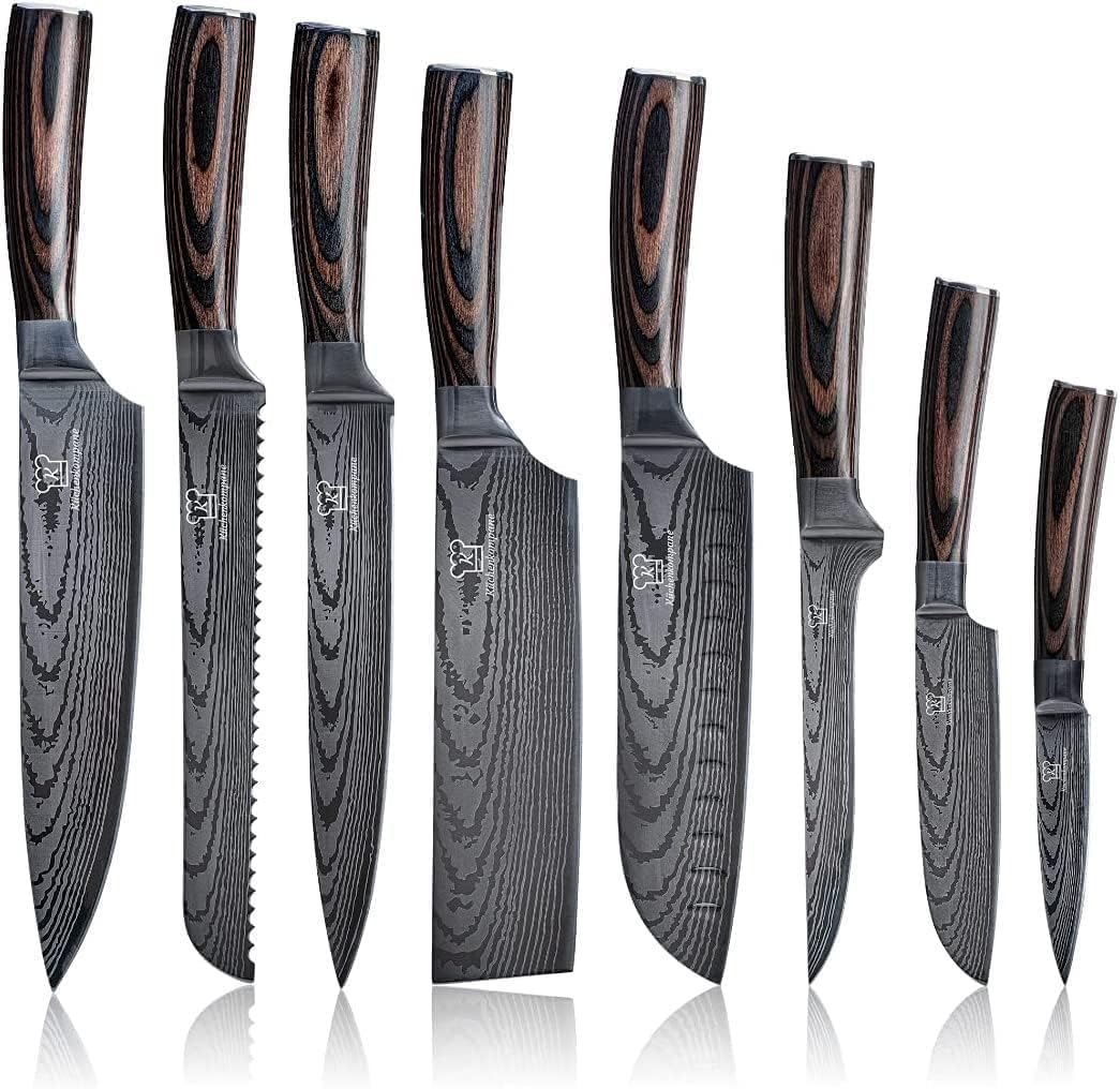 ["Complete 8-piece Asian Knife Set - This premium set includes chef's knife, bread knife, Yanagiba knife, Nakiri knife, Santoku knife, fillet knife, and petty knife, ideal for precise cutting tasks in any kitchen. Perfect for home cooks and professionals.",