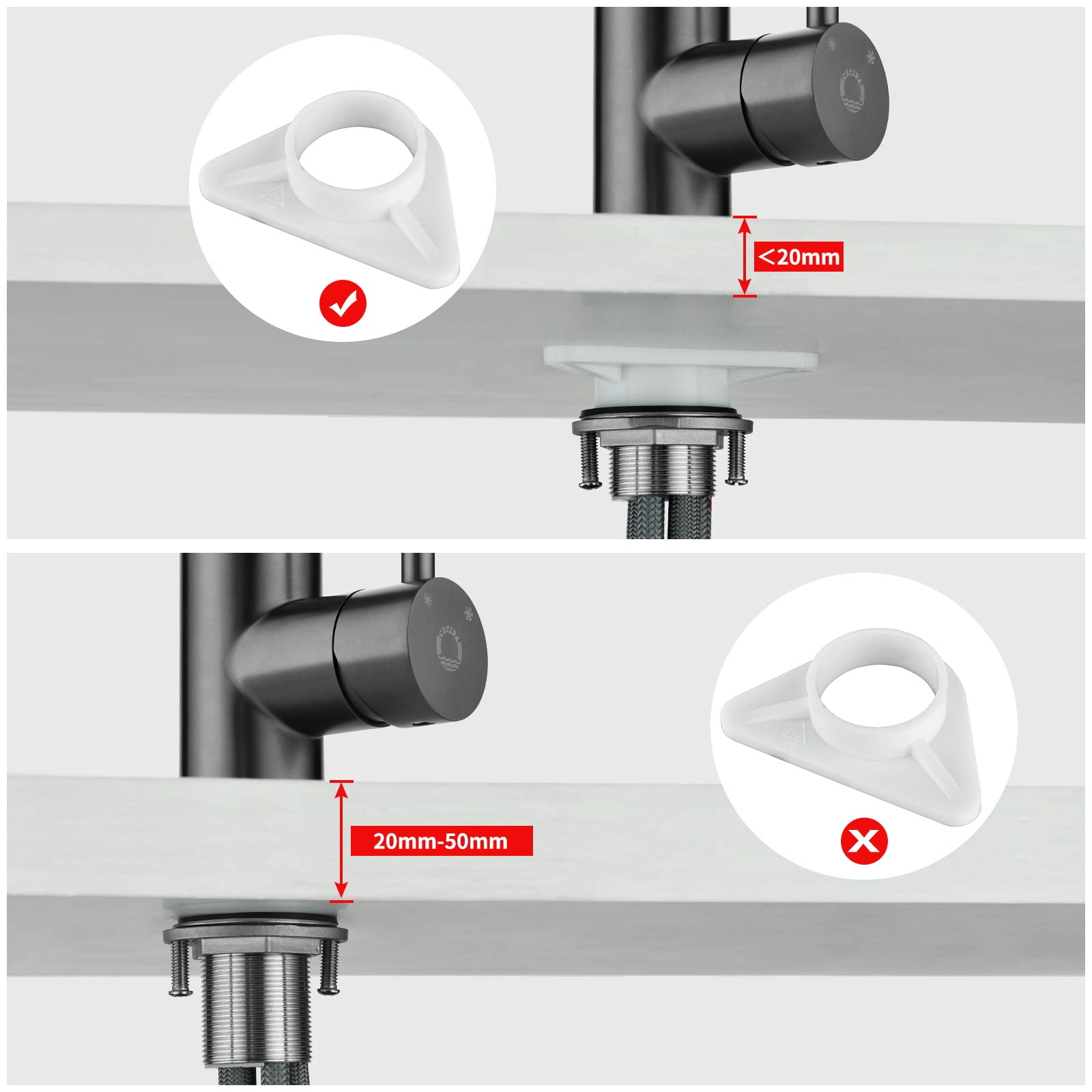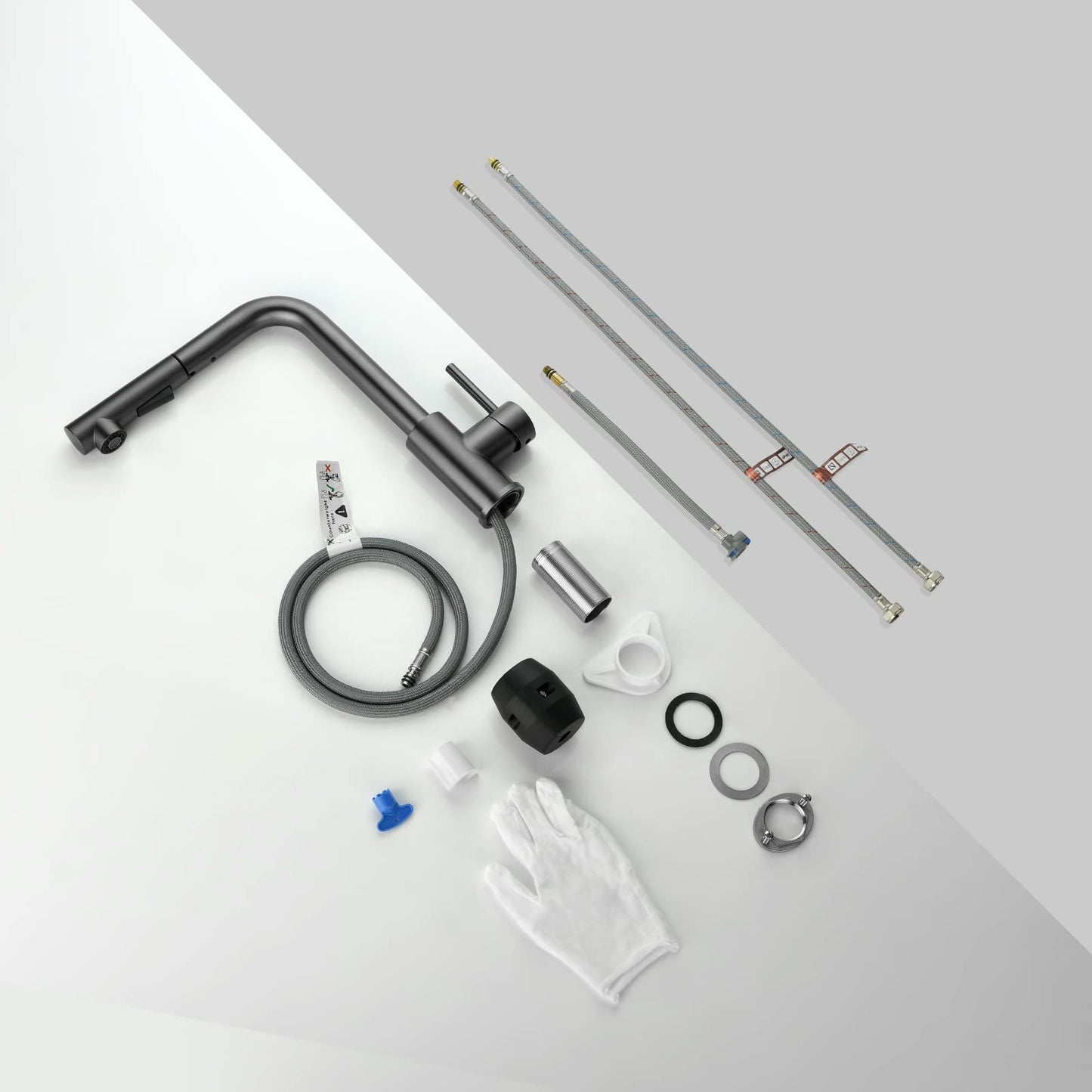 ["FLEXIBLE USE: The kitchen faucet sprayer can extend up to 40 cm, allowing you to clean every corner of the sink and use water from a distance. The mixer tap can rotate 360 degrees with one hand, suitable for single and double sinks. The 'L'-shaped sink tap not only increases kitchen flexibility but also accommodates larger cookware, such as a pot for asparagus.","MULTIFUNCTIONAL SINK FAUCET: This extendable kitchen faucet has 2 spray modes, saving up to 40% water. The classic water flow is soft, while the shower water effectively washes dirt off dishes. The faucet uses an ABS bubbler, and the package includes a disassembly tool for easy removal and regular cleaning of the aerator.","MATERIALS: The 304 stainless steel kitchen faucet is anti-fingerprint and easy to clean, with a gray-black surface that will appeal to the understated home cook. Our kitchen tap sprayer can control hot and cold water with a single button. The high-performance ceramic valve ensures easy and precise adjustment of water flow and temperature, anti-aging, high pressure resistance, and no dripping.","HOSE: CECIPA kitchen faucet comes with two NEOPERL hot and cold water inlet hoses, each 600 mm long with a 3/8-inch nut, complying with international water inlet standards. The recommended diameter of the faucet installation hole is 35-38mm. Additionally, there is a fixed triangular plate for use when your countertop is less than 20 mm thick, effectively preventing faucet wobbling.","PACKAGE CONTENTS: 1 × kitchen faucet, 1 × gravity ball, 2 × inlet hose, 1 × aerator removal tool, 1 × installation gloves, 1 × manual included. Easy installation of kitchen faucet with sprayer without a plumber. We provide an installation video. If you have any questions, feel free to contact us. We will reply within 24 hours."]