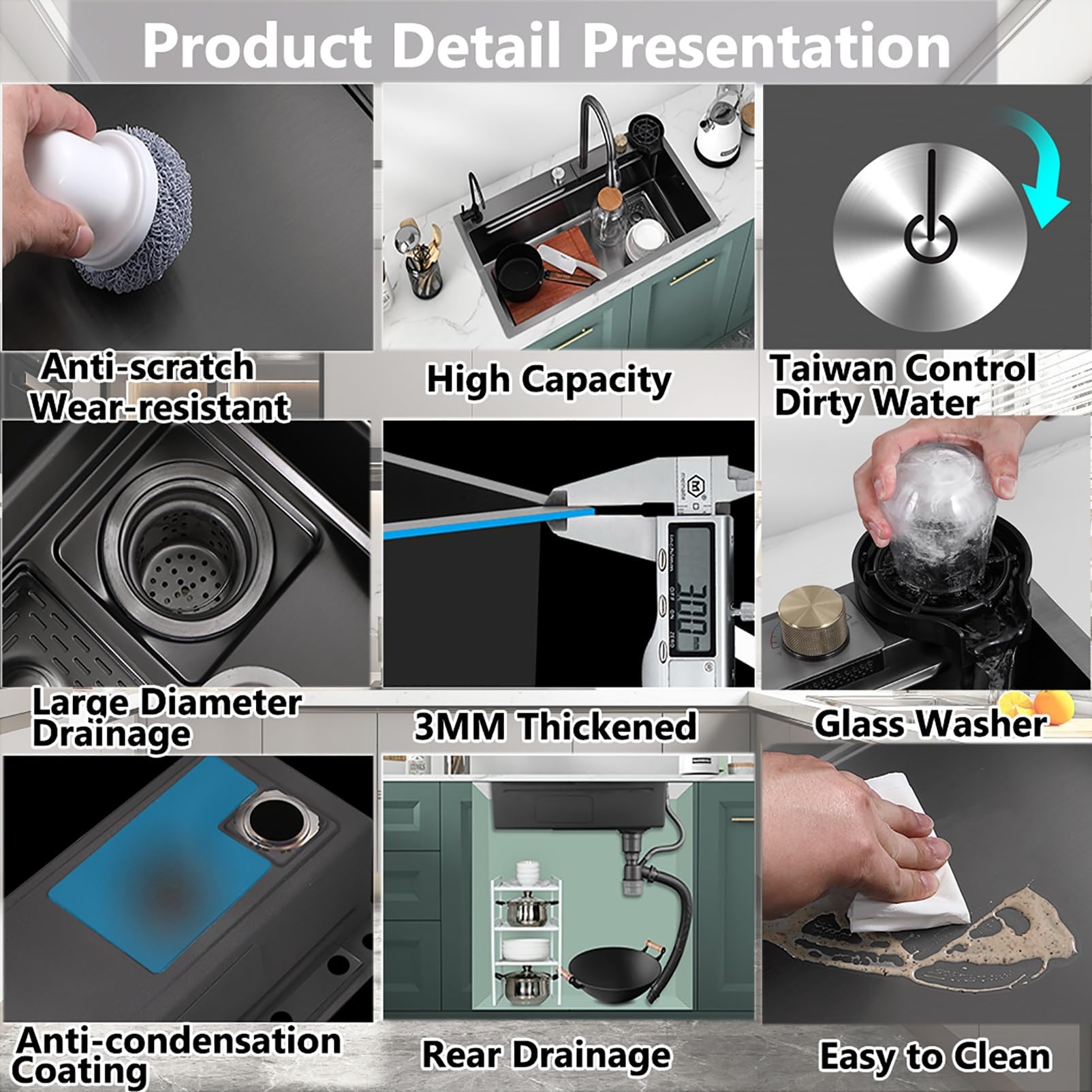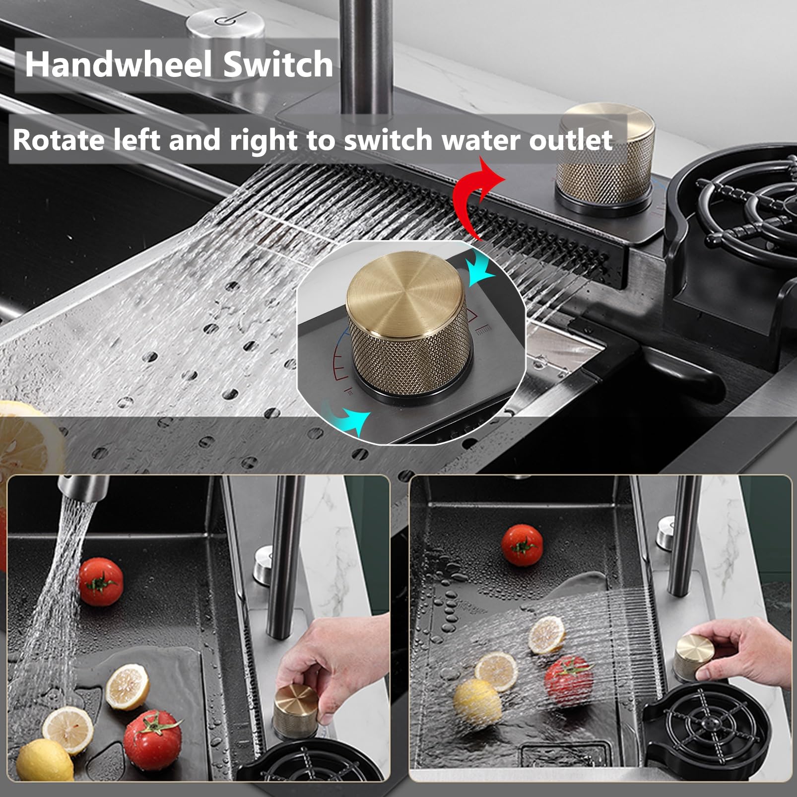Kitchen sink Stainless steel Sink Black Waterfall Kitchen Sink With Cup Washer, Built-in sink Kitchen sink Glass washer For sink, Integrated sink With faucet Waterfall)
