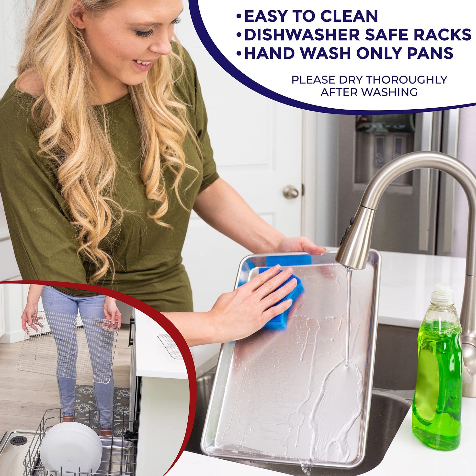 ["VERSATILE KITCHEN HELPER: Our baking sheets and kitchen racks can be used for a variety of dishes and desserts. Roast vegetables, cook bacon, bake sweet treats, or make crispy chicken wings in the oven", "THE PERFECT SET: Use our set individually or together. Place the rack on the baking sheet to cook food on it. Or bake directly on the sheet and use the kitchen rack to cool cookies, cakes, and more", "DEVELOPED BY PROFESSIONALS: The kitchen rack is designed with a tight grid pattern to prevent baked goods from sagging or falling through. The large 2.5 cm wide feet provide ample airflow and allow for even cooking and cooling of all types of food", "DURABLE: Our baking sheet & kitchen rack set is designed for heavy use and is therefore very durable. It is made of aluminum, which does not warp even with prolonged use in the oven and is best for hand washing only. Each kitchen rack is made of stainless steel 304, rust-resistant, and dishwasher safe for easy cleaning", "DEEP EDGE: This professional ovenware has a deep edge to catch dripping liquids, for example when cooking bacon or roasting meat. The grill design of the kitchen rack allows excess oil to drain off, preventing burns", "The best gift ideas for bakers and chefs: Still looking for the perfect gift? Whether you're looking for a gift for a 10-year anniversary, the best gift for her, or the best gift for a mother who loves to bake; Or the perfect gifts for him, gifts for dad, or gifts for men who love to grill & roast. This half oven rack combined with the roasting pan is the ideal kitchen tool for roasting, grilling, or baking turkey, chicken, ham, and more. A must-have for Thanksgiving, Christmas, Hanukkah, New Year's Eve, housewarming parties, birthdays, or any occasion."]