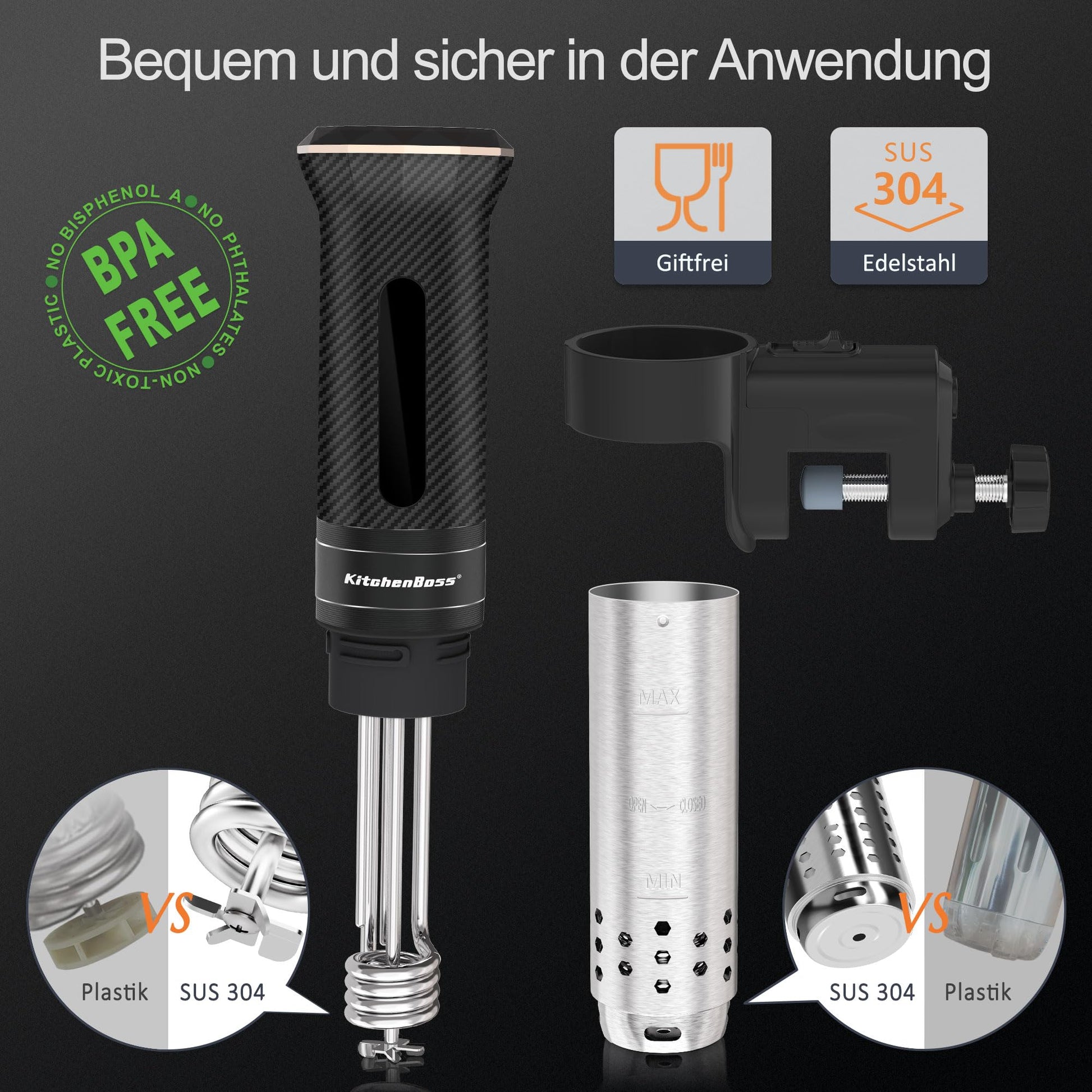["G300T is the tested winner among many products when it comes to testing Sous Vide devices on the well-known German website. It is easy to use, well-crafted, and equipped with a robust metal propeller that circulates the water, ensuring even temperature throughout.","Integrated Chef Menu: First world invention with integrated chef menu in the machine. Ensuring that food is not overcooked. This preserves more nutrients and vitamins, allowing you to enjoy the perfect taste of a top chef every time!","Stainless Steel Construction: The propeller and all parts of the water are made of SUS304 stainless steel blade, strong and durable, avoiding the use of plastic bottom shell or propeller for an extended period to avoid heat and produce harmful substances!","Ultra-Quiet: The impeller uses stainless steel double-sided 45-degree spiral design with stainless steel sleeve diamond-shaped water inlet design to prevent noise propagation to the greatest extent.","Brushless DC Motor: G300T uses the same high-quality brushless DC motor found in high-end drones, providing excellent circulation with 1100W, approximately 16L/min, very fast heating. 2900r/m uniform rotation, superpower, more durable!","Temperature Control: 104°F-194°F (40°C-90°C), continuous temperature monitoring and control of temperature stability to ensure that every part of the ingredients remains at the same temperature! Adjust the cooking temperature precisely to the doneness required for your meat, poultry, or fish. Also suitable for warming baby food, heating lids in a hot water bath, making yogurt, and gently thawing frozen foods.","Waterproof and Easy to Clean: It is waterproof up to IPX7 and can be cleaned by immersing the entire body in water, allowing you to clean every oil stain deeply.","Laser Welding Technology: The Sous Vide uses point-to-point welding technology to weld the head and body of the stainless steel sleeve to ensure that each connection is perfectly welded. We pay attention to every detail of the product, ensuring your safe use.","Safety Alarm: If the water level drops below the specified minimum value on the immersion heater and the temperature reaches the pre-set value, the vacuum tine bird stops and alerts you. Sous Vide cooking pots are easy to clean. Do not exceed the maximum water level after this water level, as it is not waterproof. Note: Contact us in the -messages for a guide in German.","Sous Vide Cooker Stick Precision Cooker Precise Temperature Setting IPX7 Waterproof LED Touch Display Immersion Circulator 3D Circulation with Timer"]