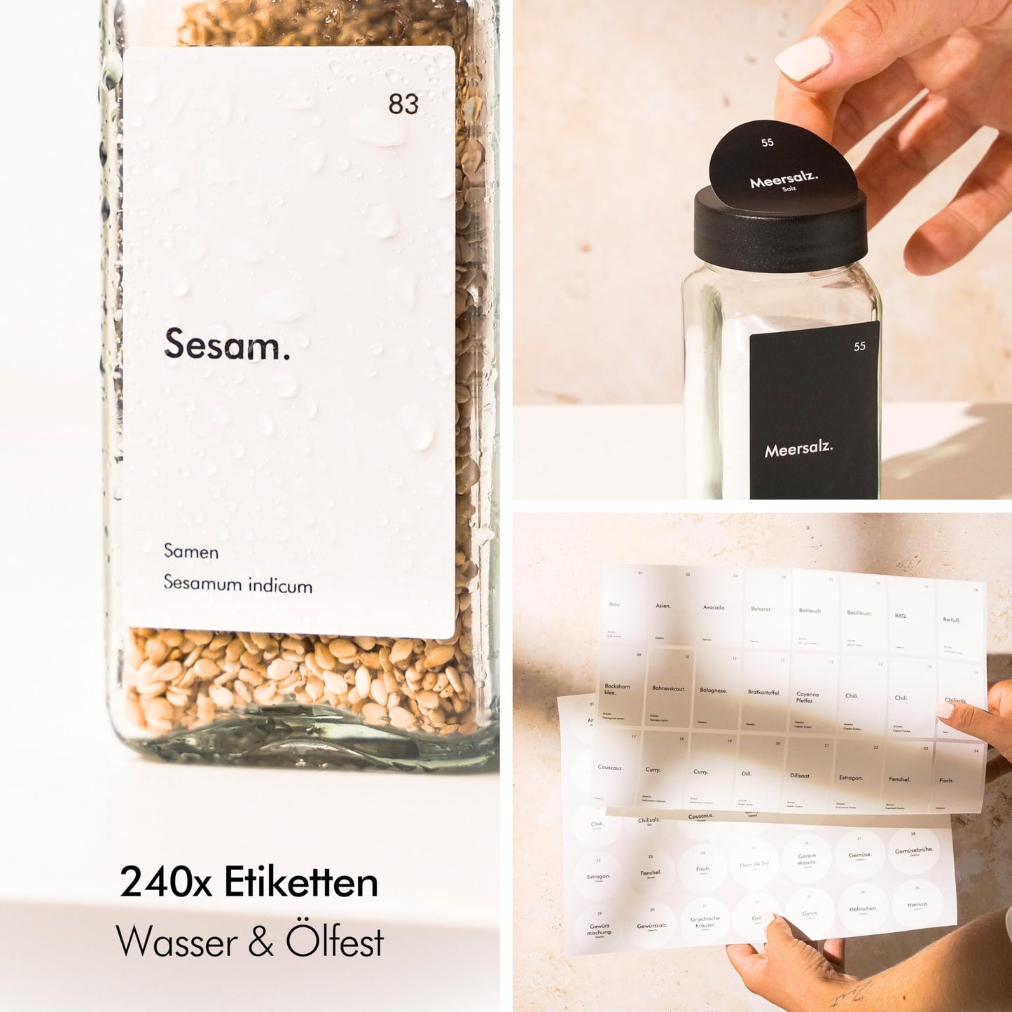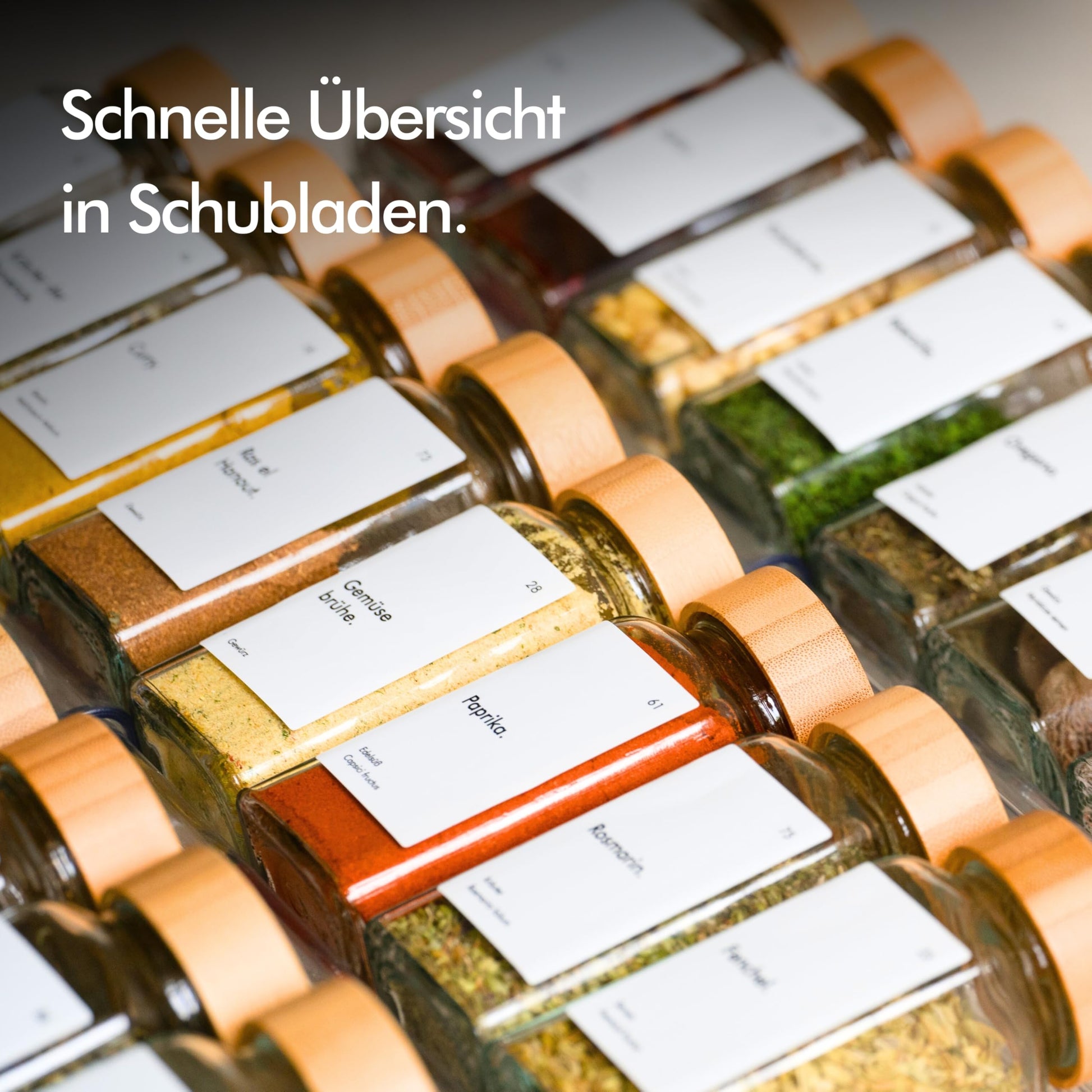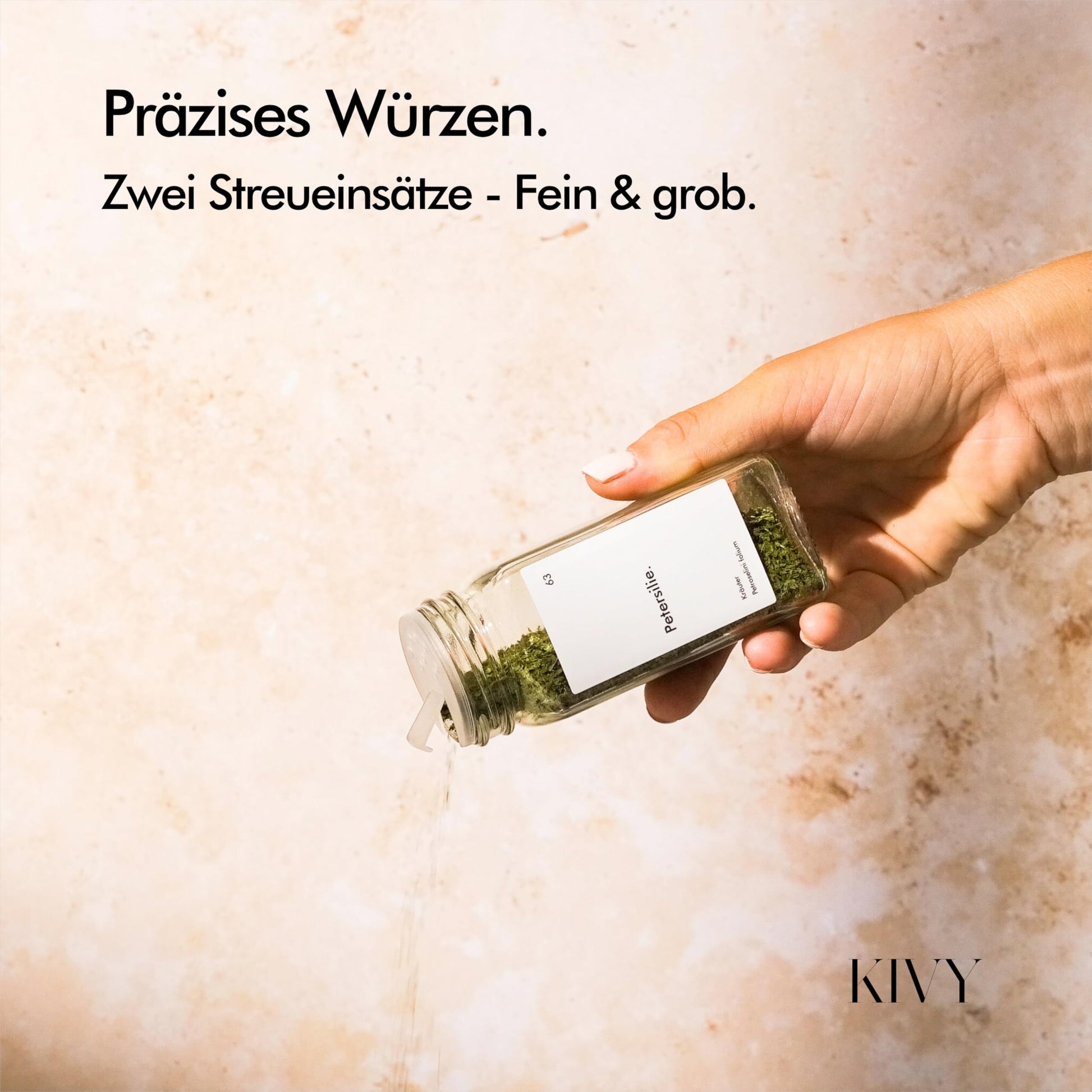 ["INCLUDED: Spice Drawer + 24 Spice Jars with Sprinkle Inserts + 240 Waterproof Labels + Funnel - Shelf Dimensions: (6 Parts) - Length: 38cm | Width: 30 - 60cm flexible adjustable","ADJUSTABLE WIDTH: Our Spice Drawer Insert features a continuously adjustable width and fits perfectly in any drawer. Additionally, the shelf is tailored for the 24 spice jars.","HIGH QUALITY: This spice organizer is made of durable and sturdy metal. Additionally, the shelf is easy to clean.","QUICK OVERVIEW: Thanks to the levels, you get a quick and structured overview of all spices. The minimalist design of the spice labels ensures a uniform kitchen.","MATCHES KIVY PEPPER MILL - The KIVY pepper mill is perfectly matched with the shelf and spice jars. This way, you can store all spices and have a free work surface."]