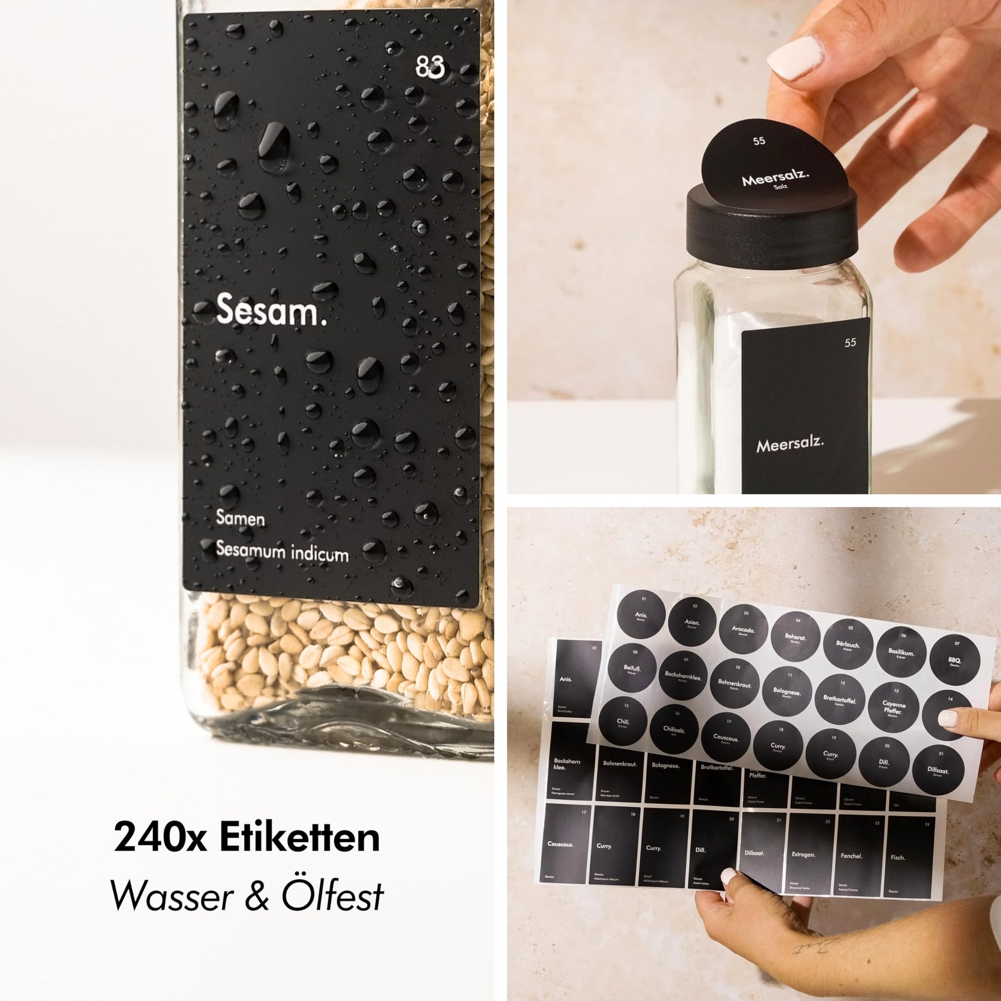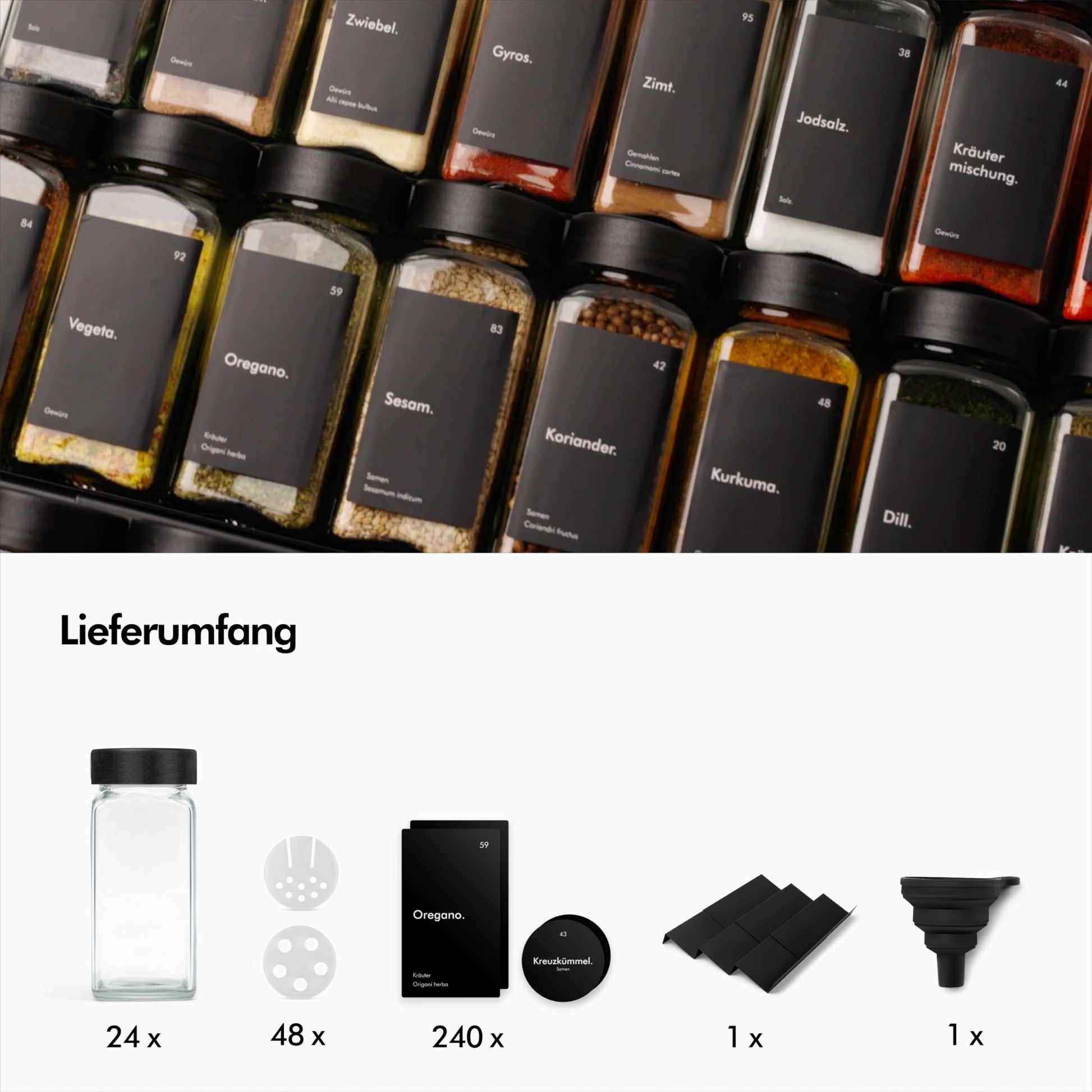 ["INCLUDES: Spice Drawer Rack + 24 Spice Jars with Sprinkle Inserts + 240 Waterproof Labels + Funnel - Rack Dimensions: (6 parts) - Length: 38cm | Width: 30 - 60cm flexible adjustable","ADJUSTABLE WIDTH: Our spice drawer insert features continuously adjustable width and fits perfectly in any drawer. The rack is also designed to fit the 24 spice tins snugly.","HIGH-QUALITY CRAFTSMANSHIP: This spice organizer is made of durable and sturdy metal. Additionally, the rack is easy to clean.","QUICK OVERVIEW: Thanks to the levels, you get a quick and structured overview of all spices. The minimalist design of the spice labels ensures a uniform kitchen.","MATCHING KIVY PEPPER MILL - The KIVY pepper mill is perfectly matched with the rack and spice jars. This way, you can store all spices and have a free workspace."]