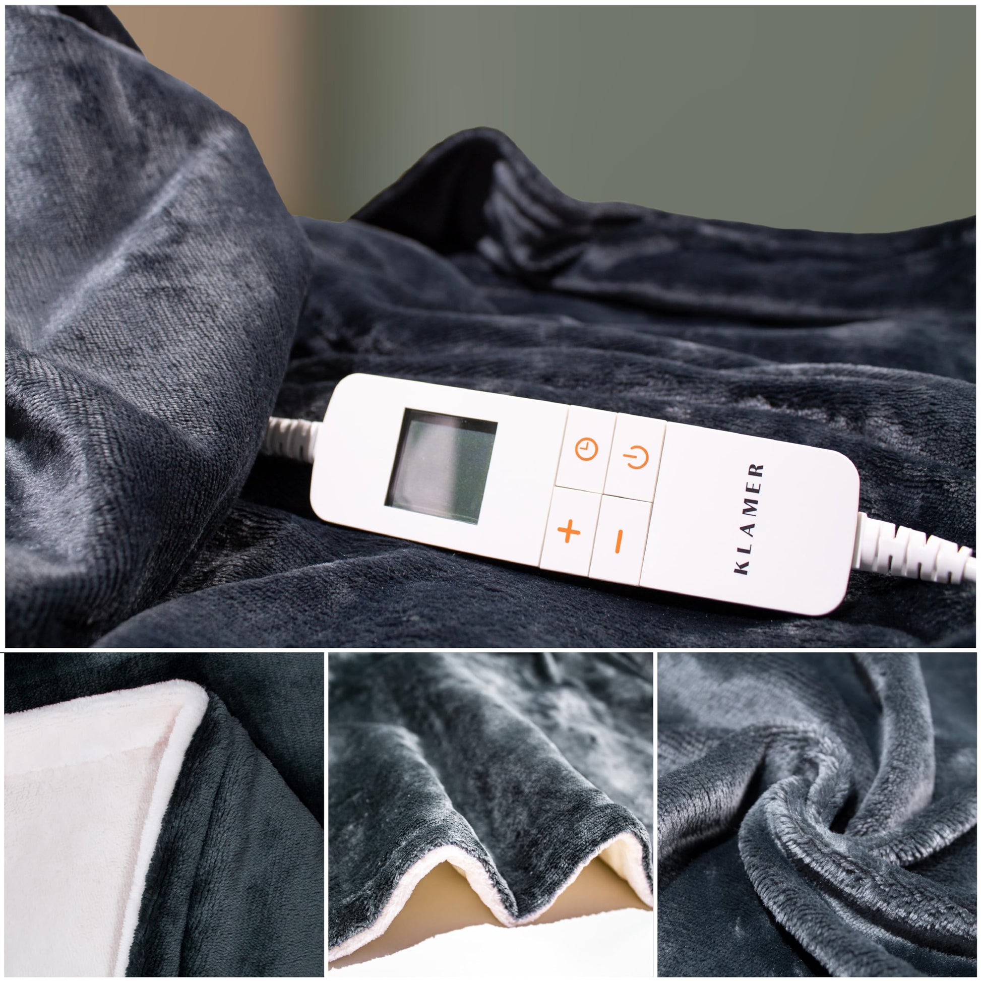 KLAMER electric heated blanket with automatic shut-off, 180x130 cm, washable, 10 temperature levels, suitable for bed, sofa, and office, dark grey.