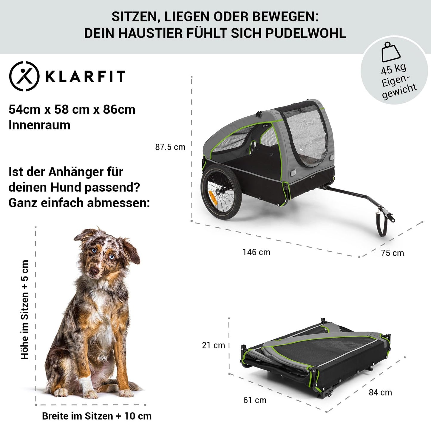 FOLDABLE & ADJUSTABLE DOG BUGGY: The Klarfit bike trailer can be easily stored. Use the quick release to remove the 16-inch rear wheels before folding the trailer. The handle can be adjusted in height.