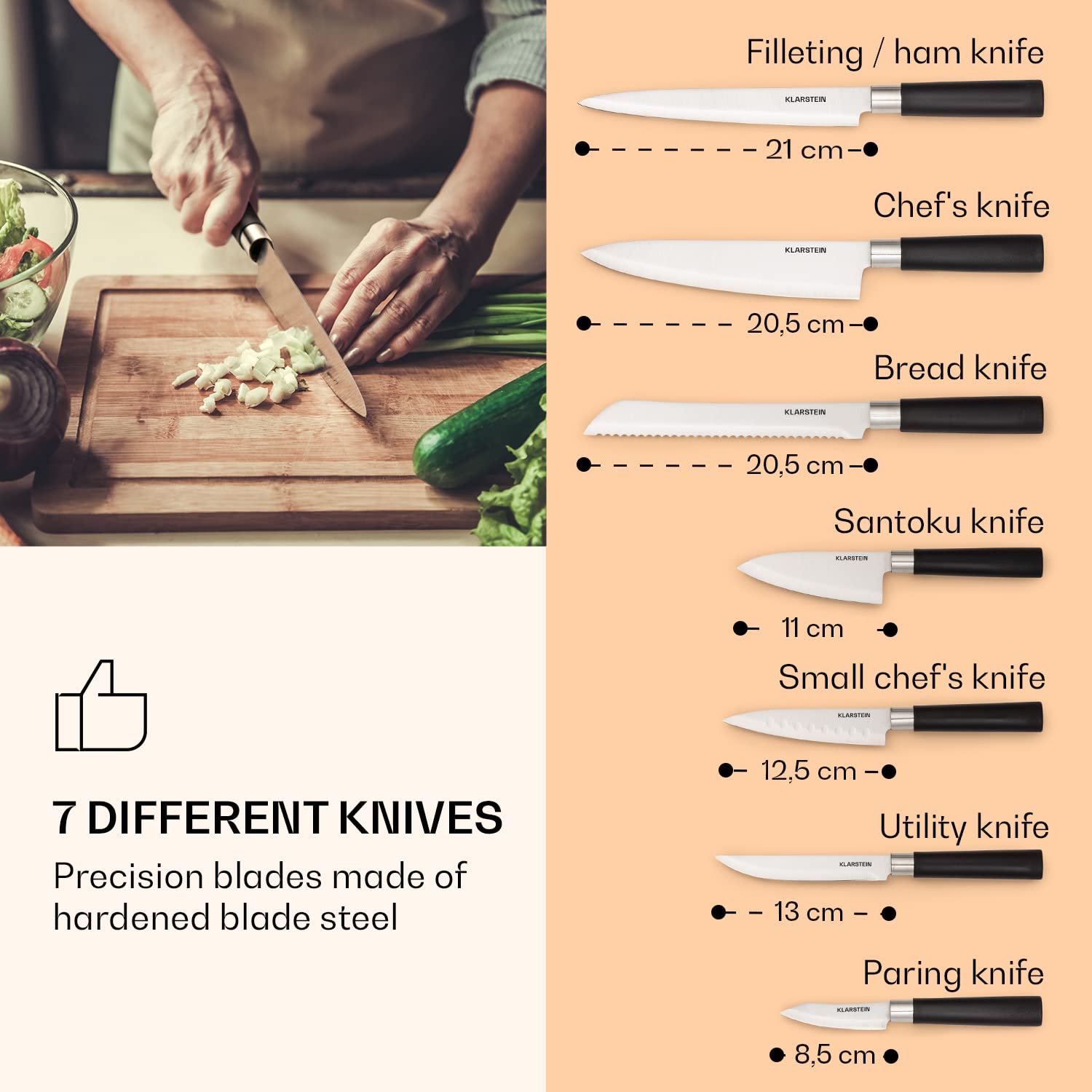 ["Plenty of space for all your knives: This knife block with knives provides space for all the knives a cook needs: chef's knife, bread knife, fillet knife, utility knife, santoku knife, and paring knife.","WITH STYLE AND SHARPNESS: Each kitchen knife in this knife block set is made of high-carbon stainless steel for precision and accuracy. This makes cutting meat as easy as cutting butter.","FAST, EFFORTLESS CUTTING: Our knife set is sharp and fits in any kitchen. The 7 knives can be removed from the knife block by rotating. The handle is strong, safe, and comfortable, providing perfect precision while cutting.","KNIFE SET WITH WOODEN BLOCK: Store this knife set in the beautiful Japanese-design wooden knife block. The Klarstein knife block keeps the blades securely in place for quick and easy access and handling.","FOR PROFESSIONALS AND HOME COOKS: This knife set belongs in the kitchen of amateur and professional chefs and will inspire you to cook. Each blade is high-quality, scratch-resistant, rust-free, and cuts, chops, and dices with ease."]