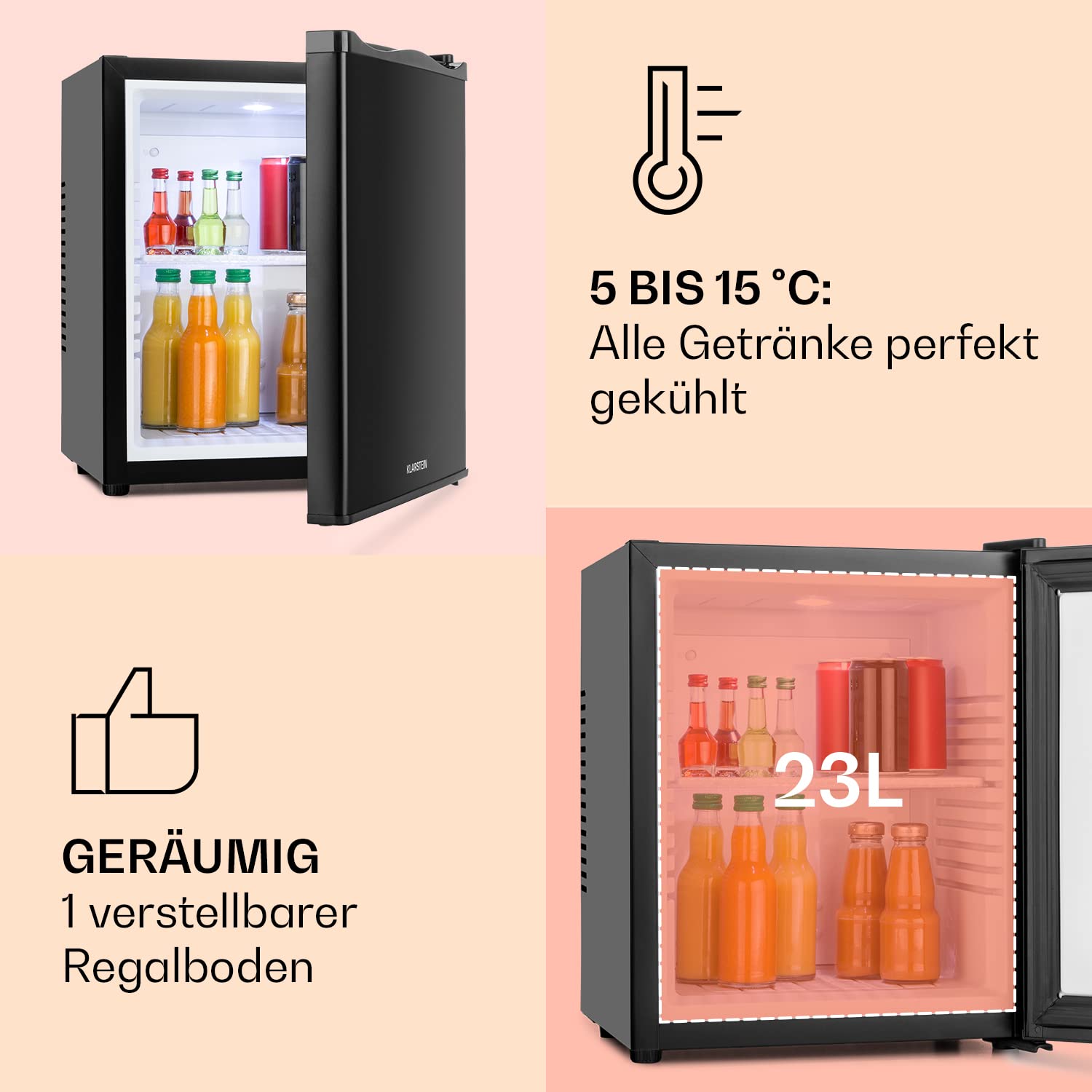 Klarstein mini fridge for rooms, 23L, for drinks & cosmetics, small mini bar, quiet, adjustable shelf, small skincare fridge 5-15°C.