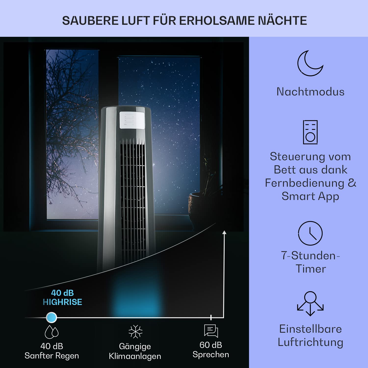 "INDIVIDUALLY ADJUSTABLE MODES: Choose between 3 speeds or switch between the Normal mode, the Nature mode where the speed varies, or the Night mode which slows down the speed before turning off."]