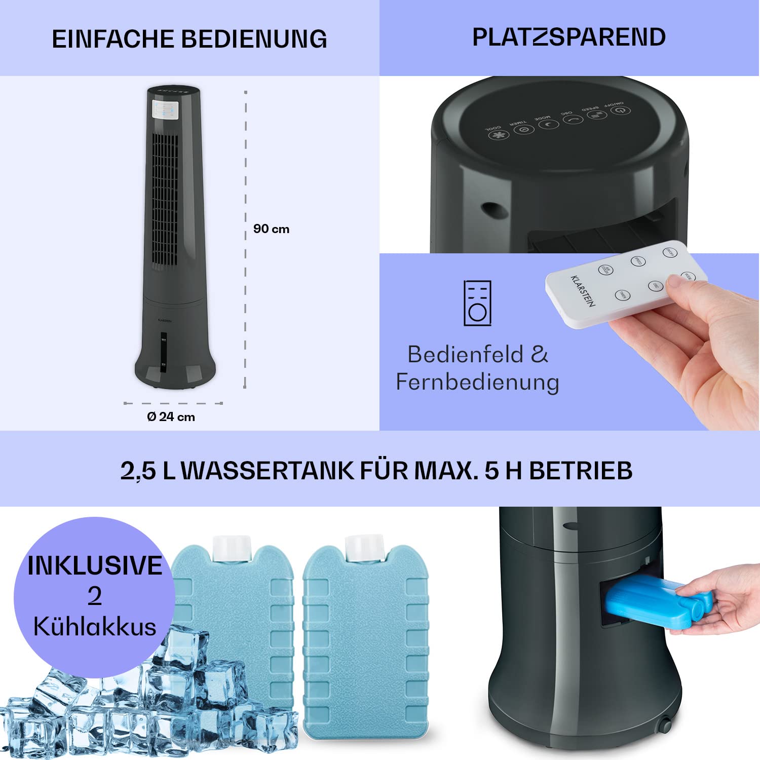 "SUSTAINABLE & EFFICIENT: With our coolant-free and environmentally friendly air conditioner, you also reduce your electricity costs. The 2.5 liter tank can be quickly refilled, and the 5h operation ensures cooling during the hottest time of the day.",