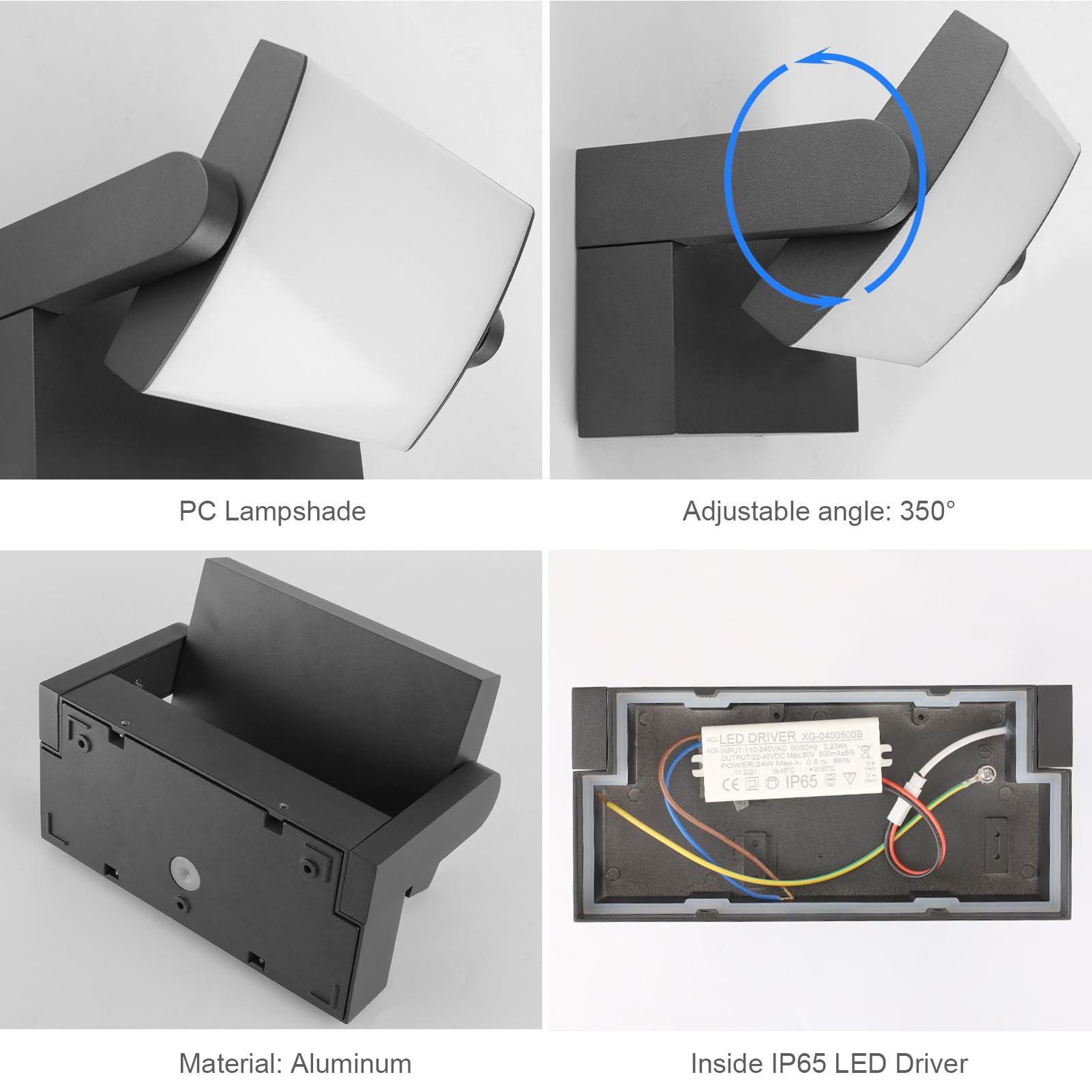["【Swiveling LED Panel】The LED panel with 105 lamp beads can swivel 350° in vertical direction. You can adjust the lighting angle to meet your needs.","【Waterproof IP65】The wall lamp is IP65 waterproof and made of high-quality aluminum, so it has excellent water resistance, making it suitable for both indoor and outdoor use.","【Modern Design】This wall light with a simple design and matte black surface creates an elegant and modern impression, suitable for various decoration styles. The wall lamp fits in your living room, bedroom, dining room, bathroom, hallway, staircase, entrance, garden, patio, and balcony.","【Premium Quality】The outer casing is made of high-quality aluminum, which is durable and easy to clean. The lampshade is made of PC, which has high temperature resistance, impact resistance, and high light transmittance.","【Easy Installation】Outdoor light with instructions and accessories, you can easily mount the wall lamp on the surface of the wall, but for your safety, please install under the guidance of a professional."]