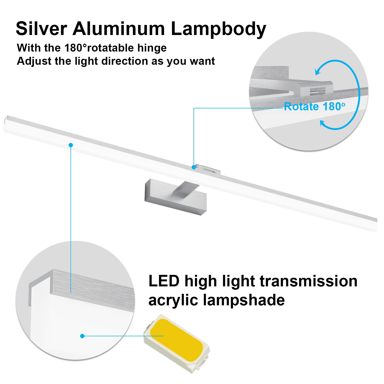 2. 180 ° Rotation: The stainless steel LED mirror lamp is 180 ° adjustable, well-made, durable. Corrosion-resistant, rust-free and ametabolic.",