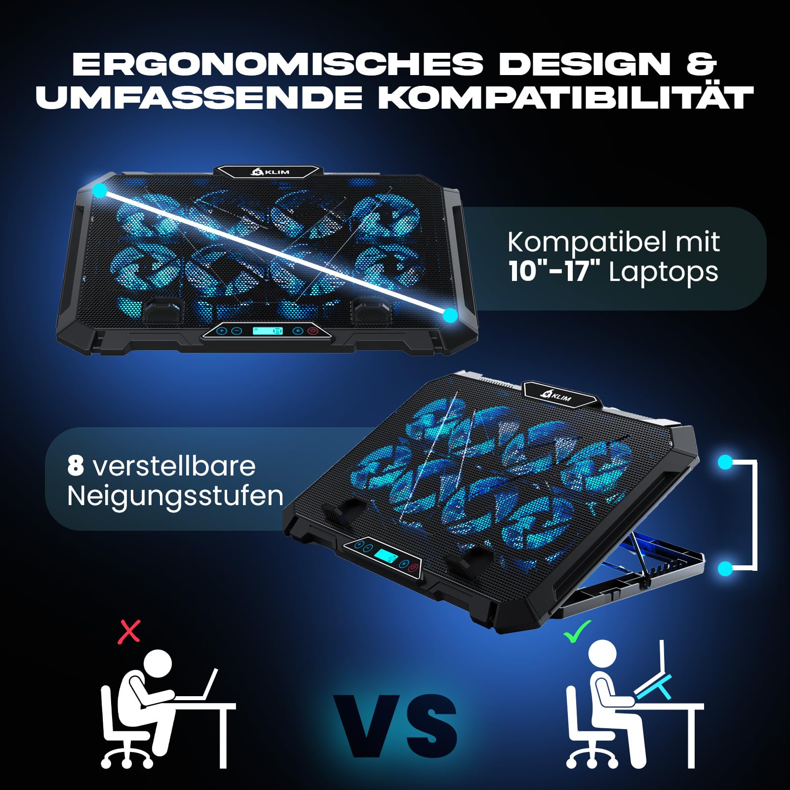 "► The KLIM V8 Notebook Cooler has an ergonomic design that allows you to adjust the angle of your laptop for maximum comfort while working or gaming. It is also compatible with most laptops on the market up to a size of 17 inches.
