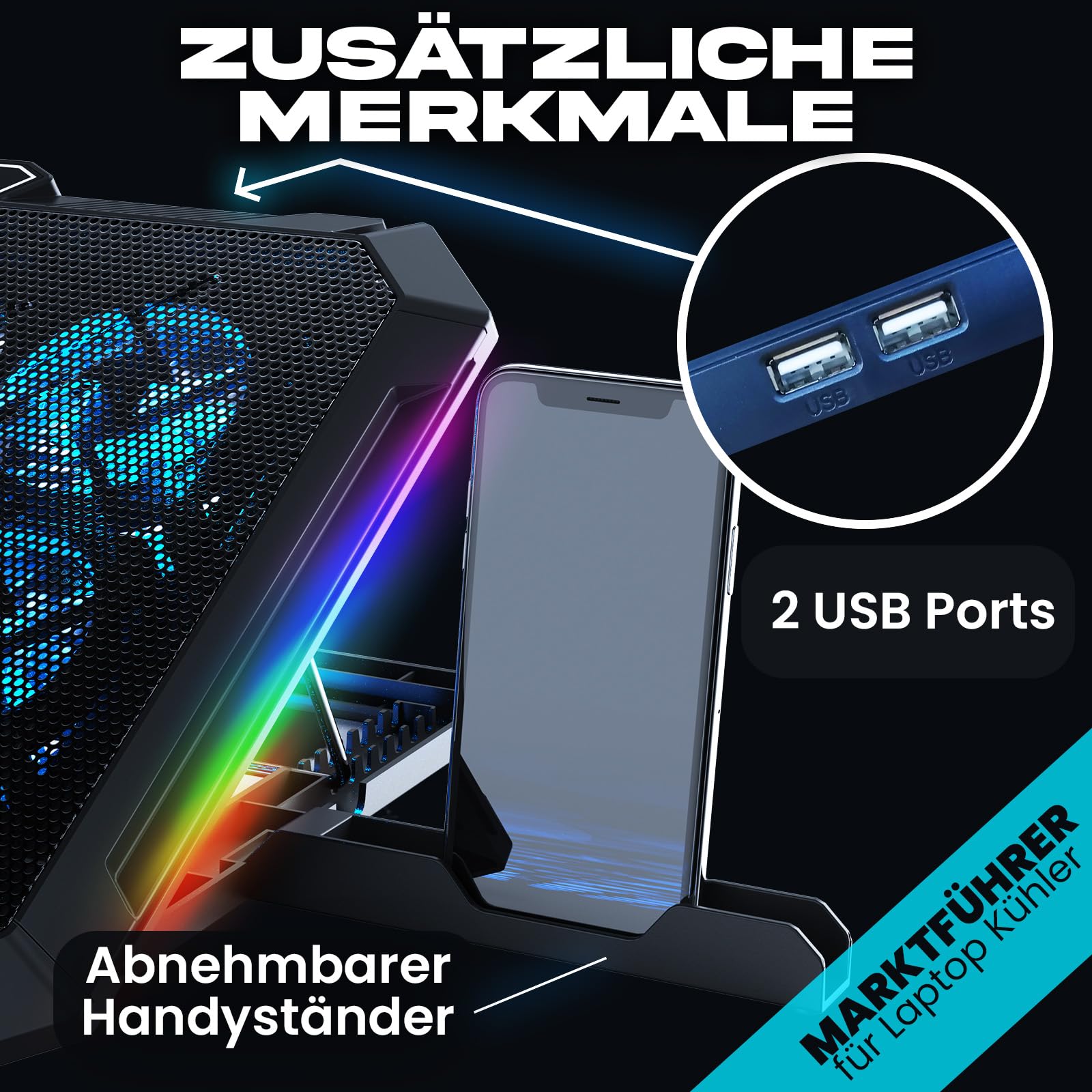 KLIM V8 Gaming Laptop Cooling Pad with 8 fans - New - Gaming Laptop Cooler - Stable RGB Notebook Stand with fans - Compatible up to 17" - 2 USB Ports - Phone holder - 5 years protection