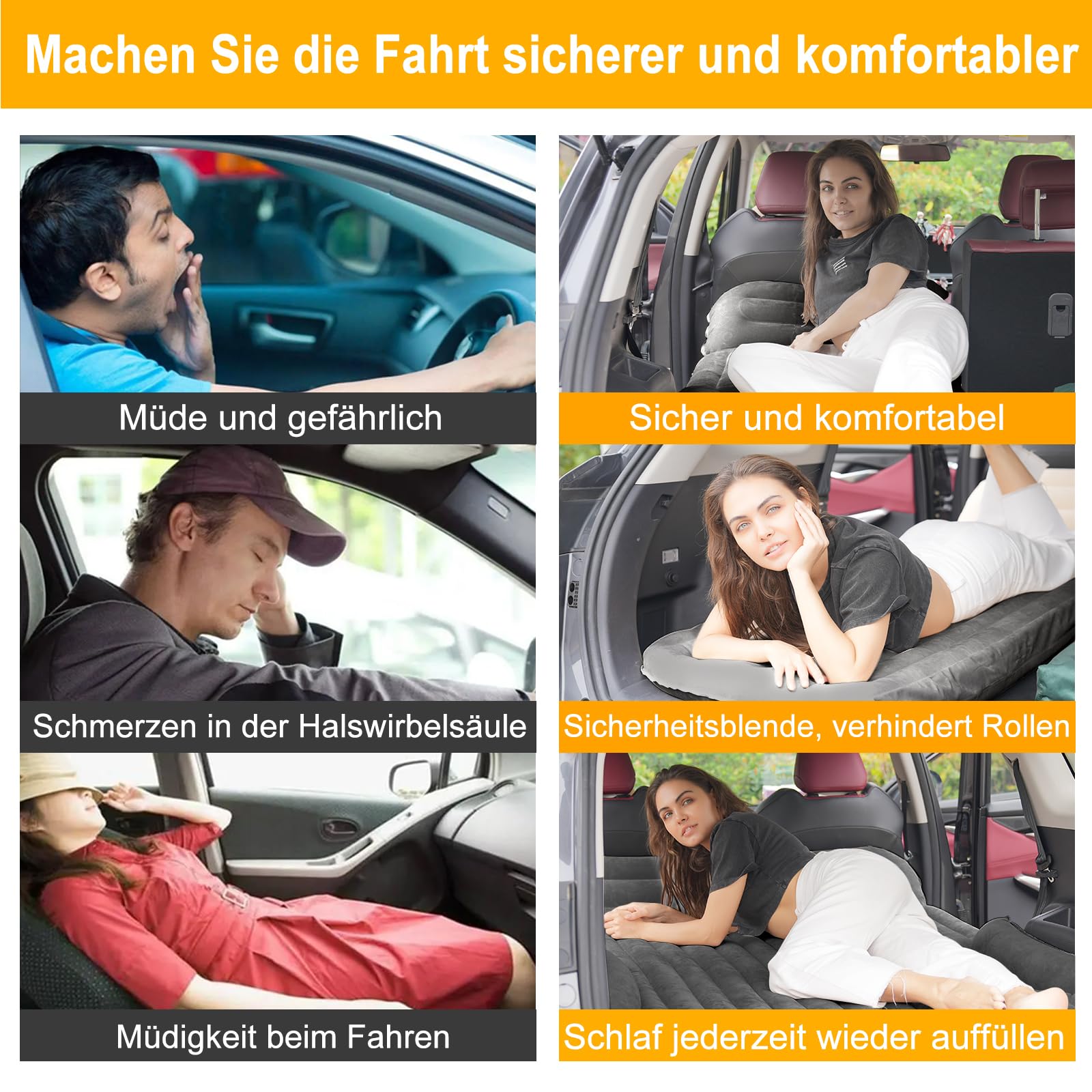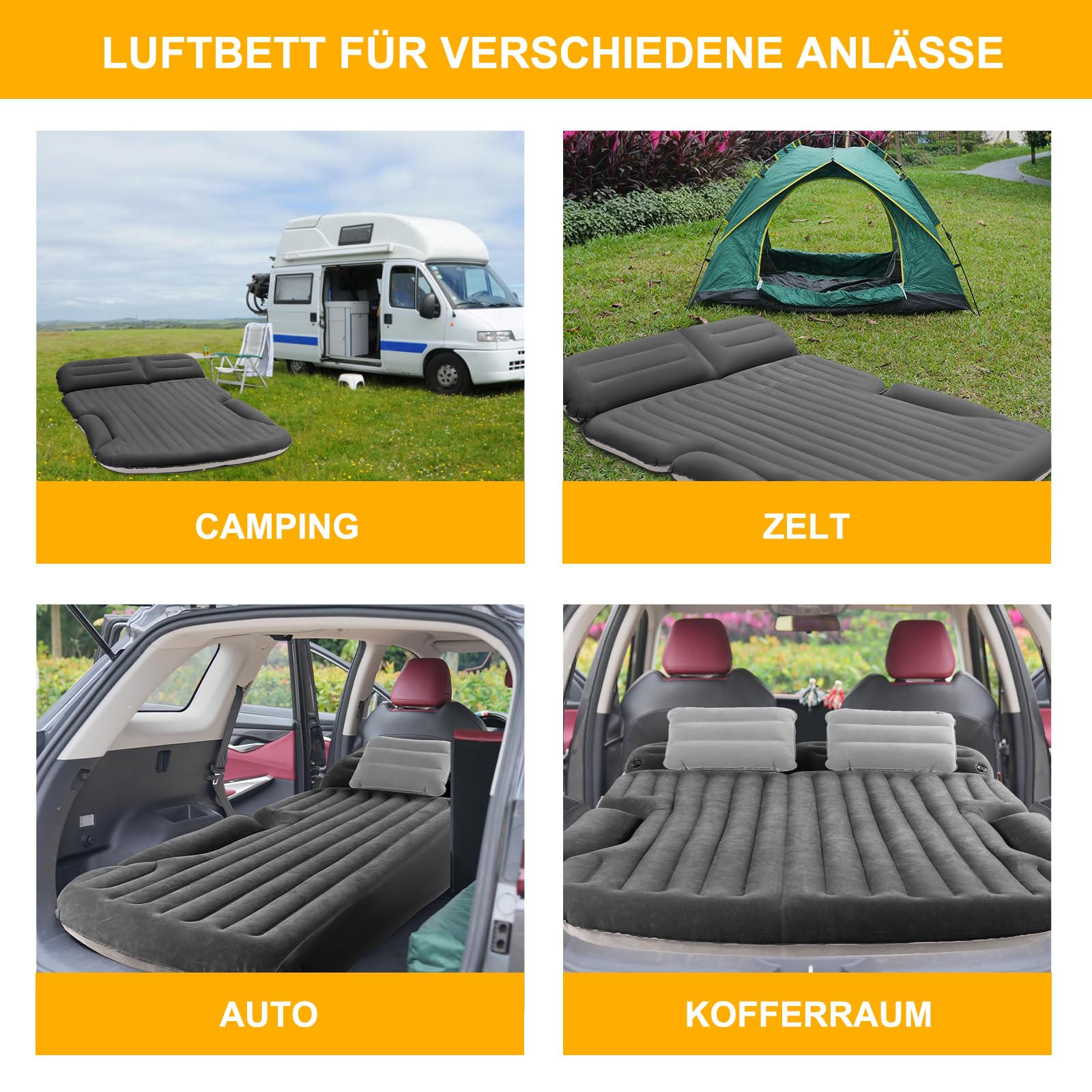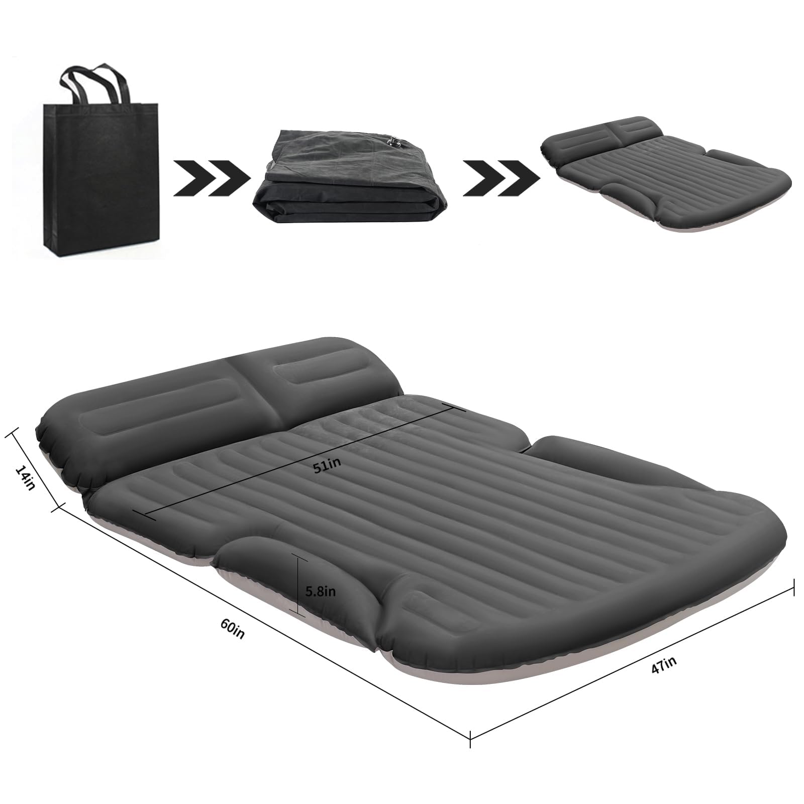 ["KMZ AUTO AIR MATTRESS - Thick double-sided plush travel camping air mattress in dark grey color, double thickened and flocked on both sides.","SKIN-FRIENDLY AND ECO-FRIENDLY - The KMZ SUV camping mattress is made of high-quality, thick flocked PVC material that is both skin-friendly and eco-friendly. This allows you to travel comfortably while protecting the environment at the same time.","4 SEPARATE AIR CHAMBERS - The car mattress features a hidden line in the middle, dividing it into four separate air chambers. You can choose to fully inflate the car bed for multiple people to use, or inflate it to 40% or 60% for single person use, depending on the available space in the back of your SUV.","VERSATILE AUTO AIR MATTRESS - The camping air mattress is versatile and can be used in various environments, including at home in the yard, on the balcony, in the bedroom or living room for guests, and more. It is also great for outdoor activities such as beach camping and road trips in SUVs, RVs, and trucks.","EASY TO USE AND CARRY - The car mattress comes with a car air pump that can be connected to the cigarette lighter to quickly inflate it outdoors. The pump can be fully charged within 2 minutes. When not in use, the mattress can be quickly deflated thanks to the three widened ventilation openings. When folded, it comfortably fits into the gift storage bag, which is easy to carry and does not take up space.","90-DAY WARRANTY - Our goal is to provide our customers with the best value for their money. We understand that our mattresses may be subjected to rough treatment during car camping, leading to potential issues like leaks or tears. Your satisfaction is our top priority. If you encounter any problems with our mattresses, feel free to contact us for support or a refund. We are here to help!"]