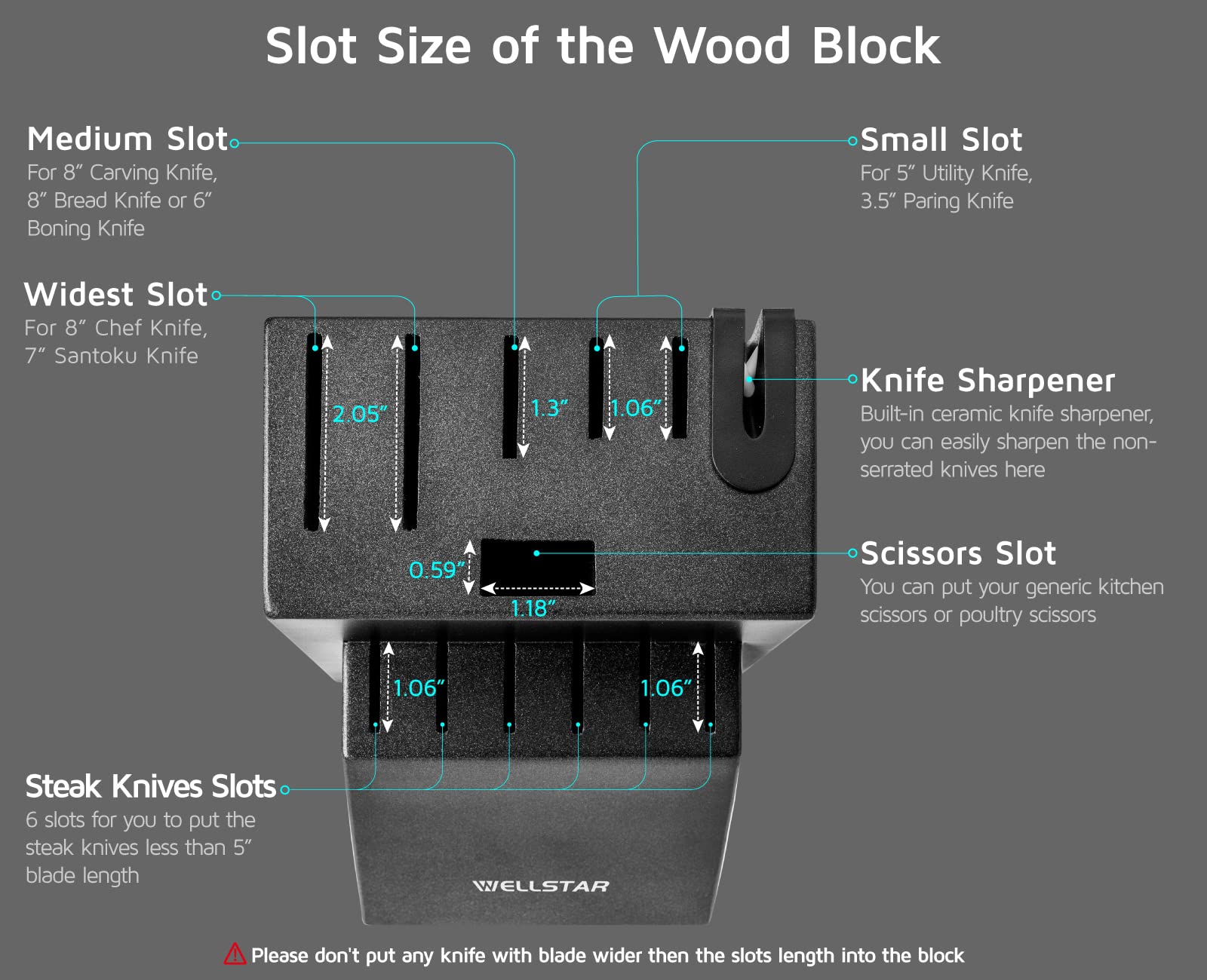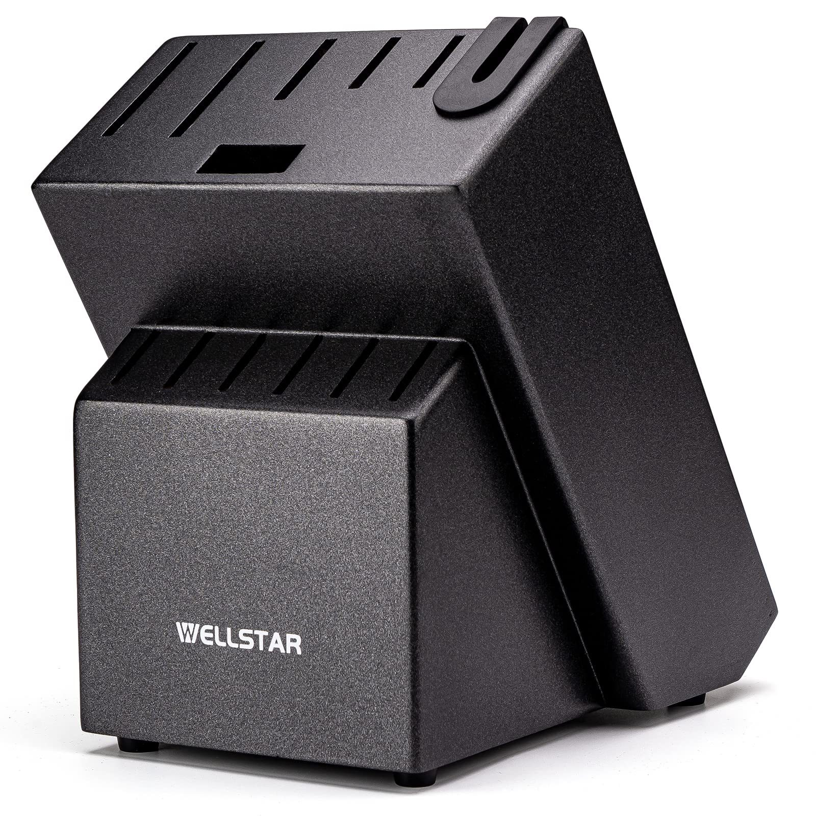 ["【11 KNIFE SLOT + 1 SCISSOR SLOT】 The knife block holds 11 knives with an additional slot for scissors. The largest slot width is 2.05" for 8" chef knives and 7" Santoku knives. The steak knife slot width is 1.06".","【STURDY WOODEN HOLDER】 Made of natural hardwood - rubberwood, our wooden kitchen knife block holder is strong and durable to hold knives. The black finish applied on the entire surface perfectly complements your modern kitchen.","【ANTI-SLIP RUBBER FEET】 Four anti-slip rubber feet are securely placed on the bottom of the block, preventing it from dangerously sliding around on your kitchen counter.","【BUILT-IN KNIFE SHARPENER】 Ceramic sharpener is built into the slot for easy and super convenient sharpening of your fine edge knives. You won't need to buy an additional sharpener, saving countertop space.","【CUSTOMER GUARANTEE-100% SATISFACTION】 Lifetime warranty, for any reason, if you are not satisfied with our product, we will offer you a full refund or replacement for a completely risk-free purchase. If you have any questions, feel free to contact us, and the WELLSTAR customer service team will respond to your inquiries within 24 hours."]