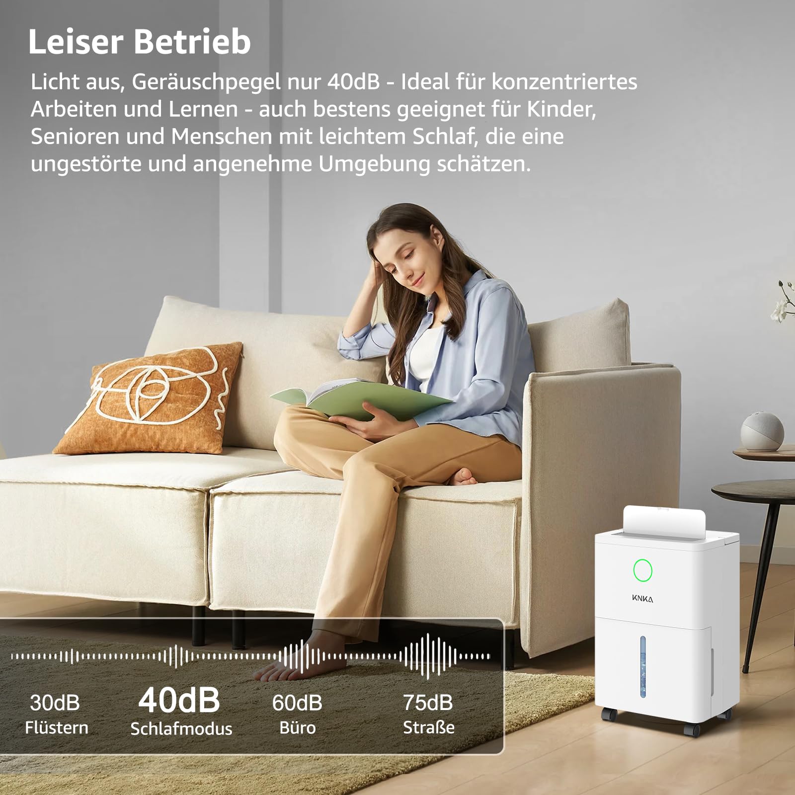 "Quiet operation, Guaranteed sleep quality – The KNKA dehumidifier with low noise is the ideal choice for your bedroom. In sleep mode, the lights automatically turn off and seamlessly blend into the sleeping environment. Compared to conventional devices (45-50 dB), it reduces sleep difficulties, extends the deep sleep phase by 18%, and ensures a peaceful night's sleep – particularly beneficial for light sleepers or households with infants/toddlers. In operating mode, the noise level remains at only 40 dB (equivalent to a library), minimizing distractions during work or study.