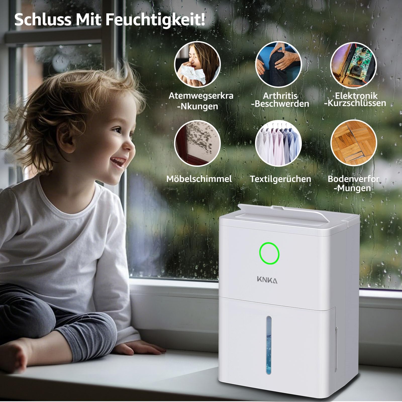 "Note: Before the first use, the KNKA dehumidifier must stand upright for 24 hours. Efficient dehumidification for a healthy and comfortable indoor climate – The KNKA dehumidifier with advanced compressor technology removes up to 9L of moisture per day (at 35°C and 90% RH). It maintains humidity levels between 45% and 65% for a dry and comfortable living environment. The electric dehumidifier features an LED humidity display that indicates the current state with colors: Blue (dry <45% RH), Green (comfortable 45%-65% RH), and Red (moist >65% RH).