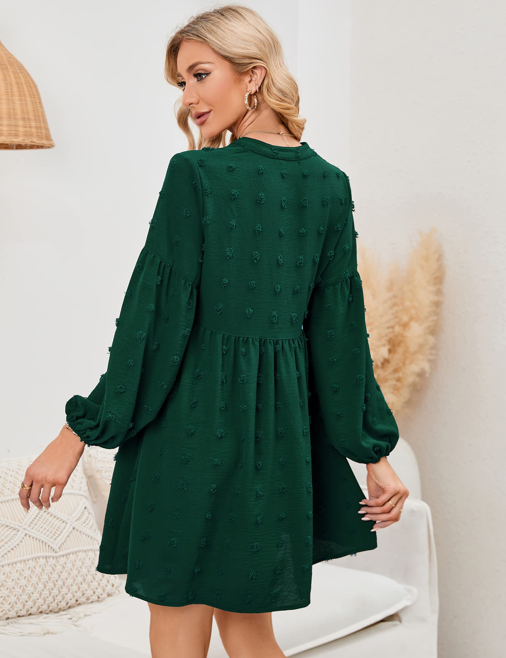 KOJOOIN Women's Tunic Dress Long Sleeve Swing Dress Short V-Neck Button Down Shirt Dress Swiss Dot Casual Mini Dress Leisure Dress with Pockets (Packaging MULTIPLE), A-Dark Green, S