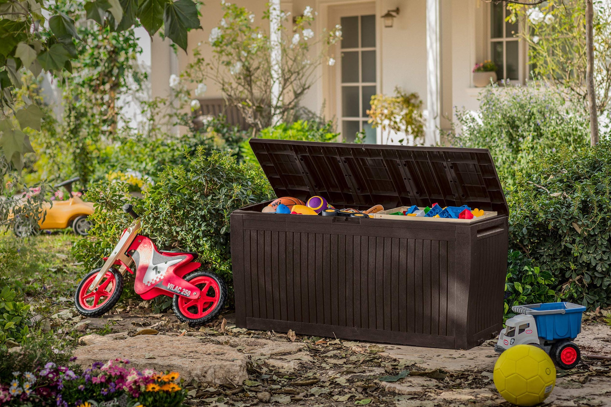 ["Plastic box in wood-look design Capacity: 270 liters, supports up to 250 kg (2 people can sit on the lid) Integrated handles and wheels for easy mobility - easy assembly in minutes Waterproof: contents stay dry and ventilated Product dimensions outside: 116.7 x 44.7 x 57 cm Product dimensions inside: 114.4 x 40 x 51.2 cm"]