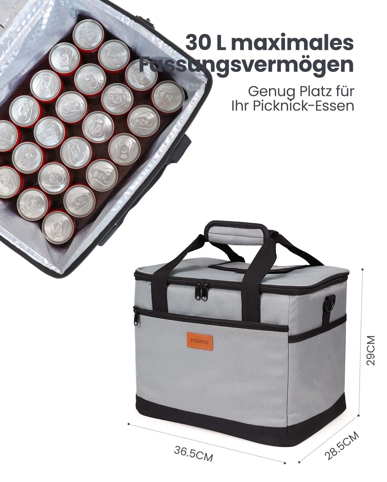 Kollea Cooler Bag - 30L Picnic Bag - Insulated Bag - Lunch Bag Keeps hot and cold, Leakproof, With carry straps, Multiple pockets - Ideal for travel, camping, BBQs, food transport