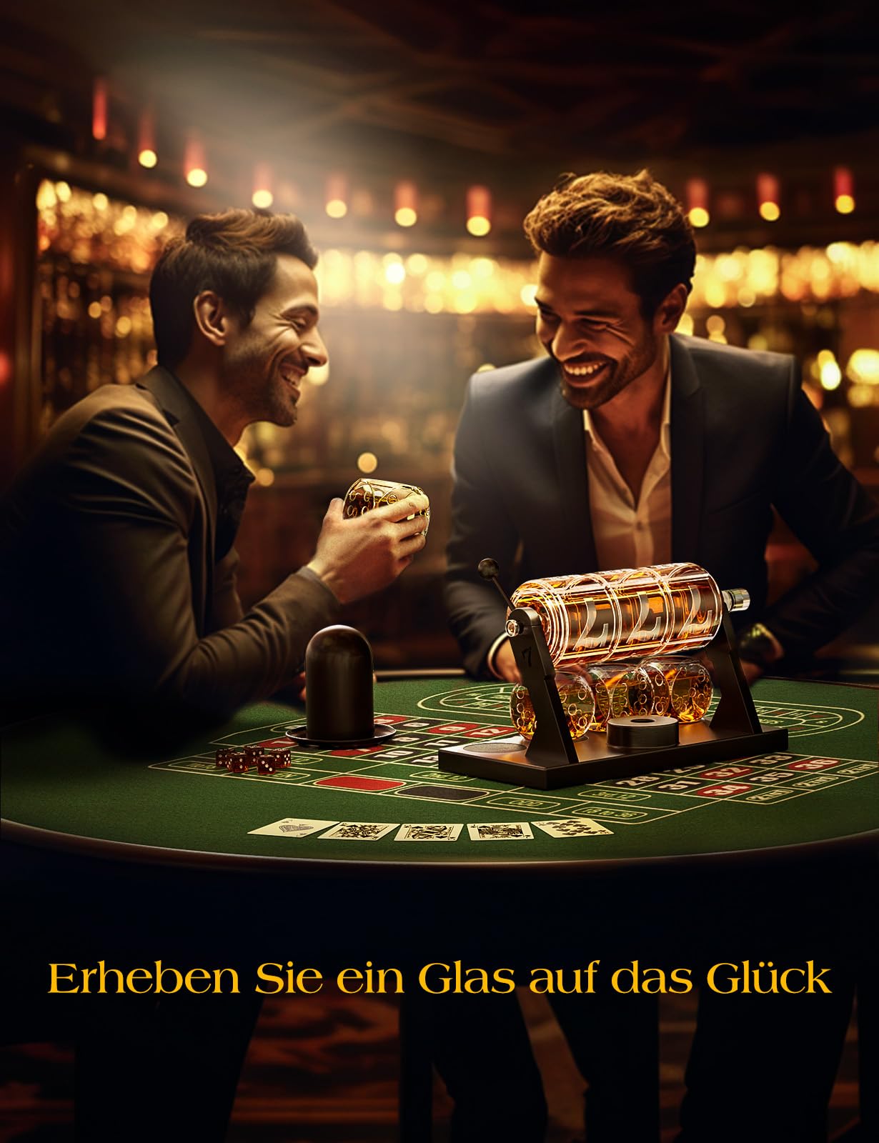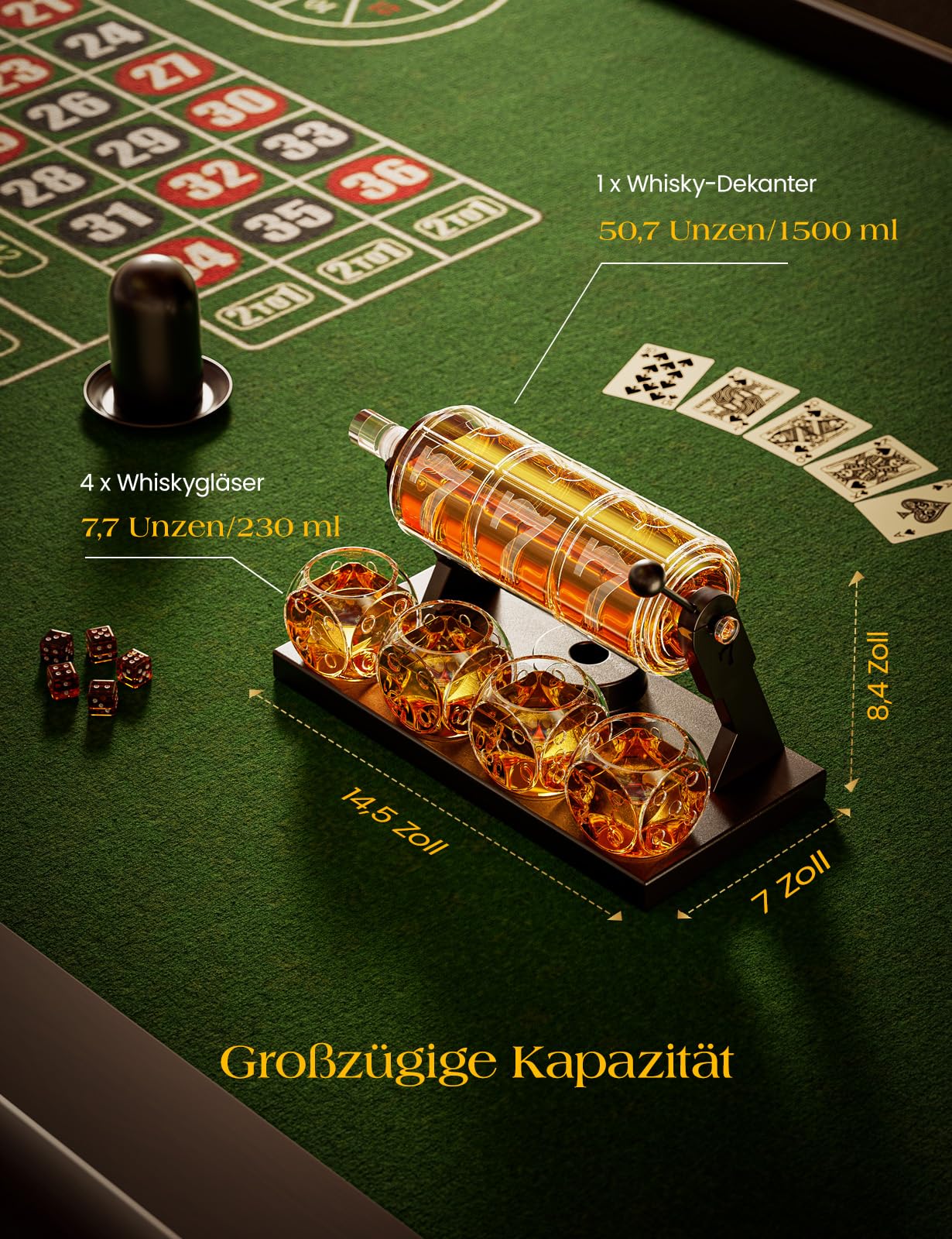 "Luxurious Design: Enhance your whiskey experience with our casino-inspired decanter. Every detail has been crafted to reflect the look of a slot machine, with a jackpot row of Lucky Sevens. The integrated wooden roulette with four dice-shaped glasses adds a touch of vintage elegance to elevate your drinking experience.