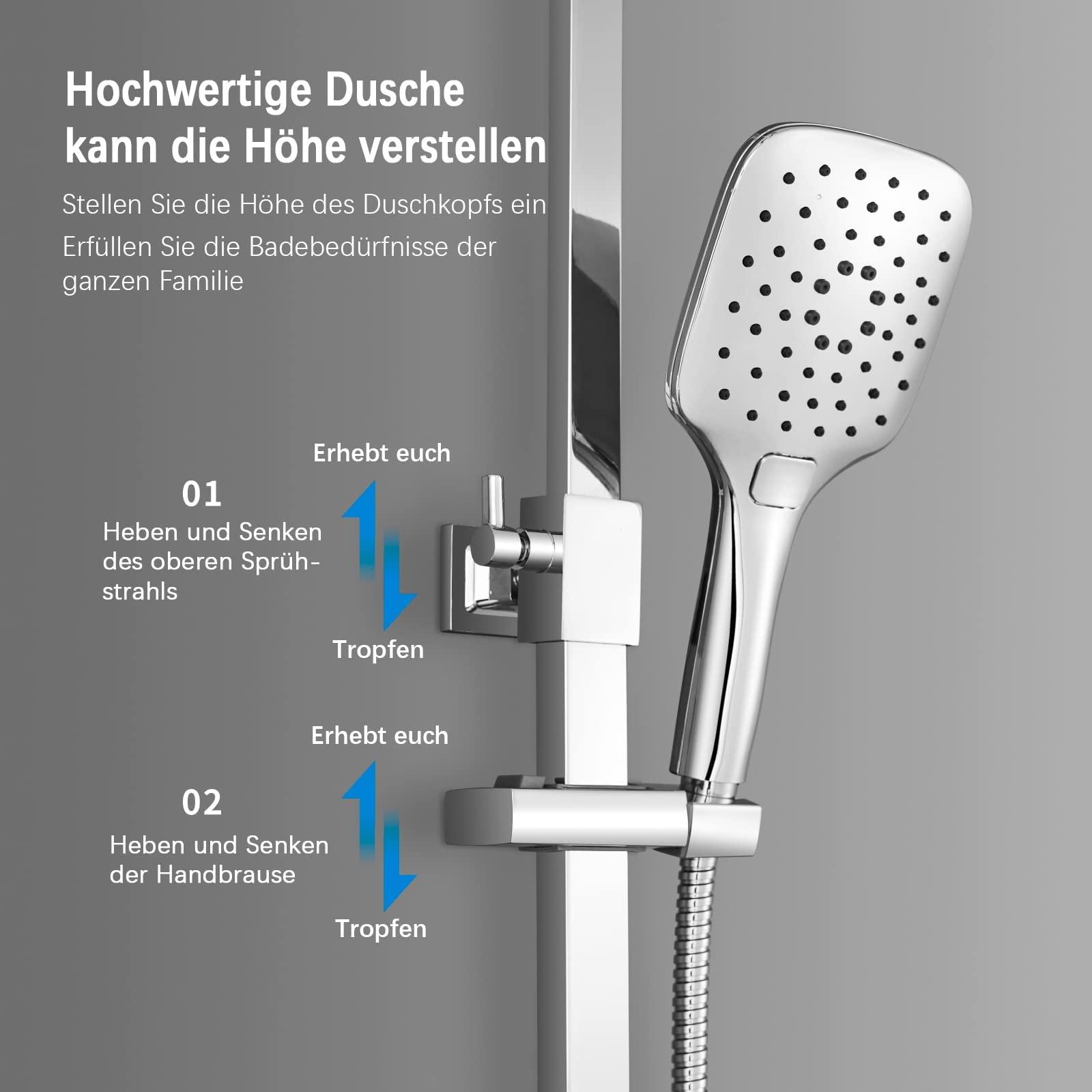 ["Large shower head: Rain shower 12*12 inches. The top can be tilted to suit your daily bathing needs. The rain shower without faucet can give you the feeling of showering under a real waterfall.","Adjustable shower rod: The height of the shower rod can be freely adjusted. The height adjustment range can be between 29.5-48 inches. The height of the hand shower and shower head can be freely adjusted to meet the bathing needs of the whole family.","High-quality shower faucet set: Shower head, shower rod, and hose are made of stainless steel, making them durable. The switch is made of solid brass, chrome-plated and polished, making it scald and rust resistant. The hand shower and shower head are equipped with silicone nozzles, which are easy to clean and prevent limescale buildup.","Hand shower with 3 spray settings: Rain, Massage, and Mixed. You can change different modes by pressing the button.","Easy to install: The KOMIRO shower system without faucet is easy to install. Just follow the detailed installation instructions to complete the installation.","CUSTOMER SERVICE - If you have any questions or dissatisfaction with the product quality, installation, etc., whether the shower column is installed or not, please do not hesitate to contact us at KOMIRO's official email address. Customer satisfaction is our goal and we are always available."]