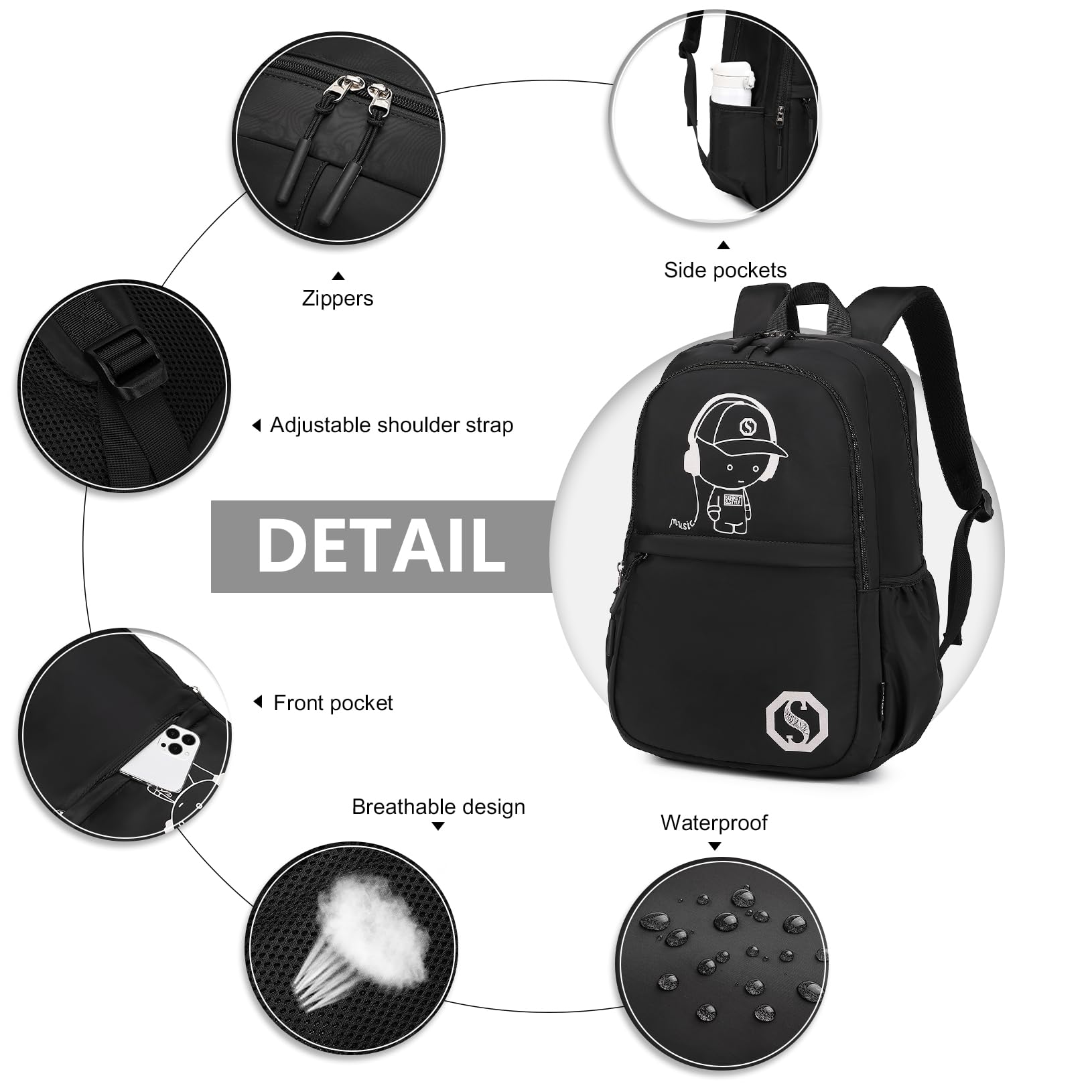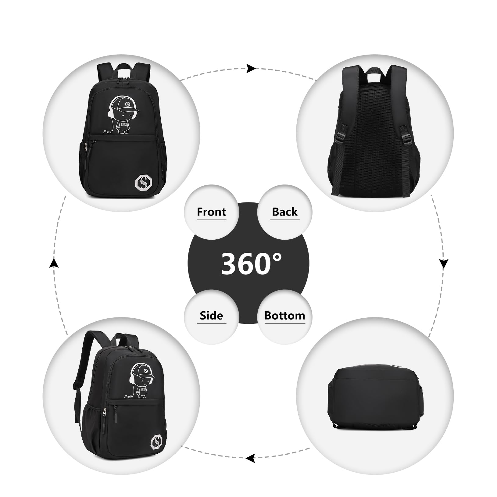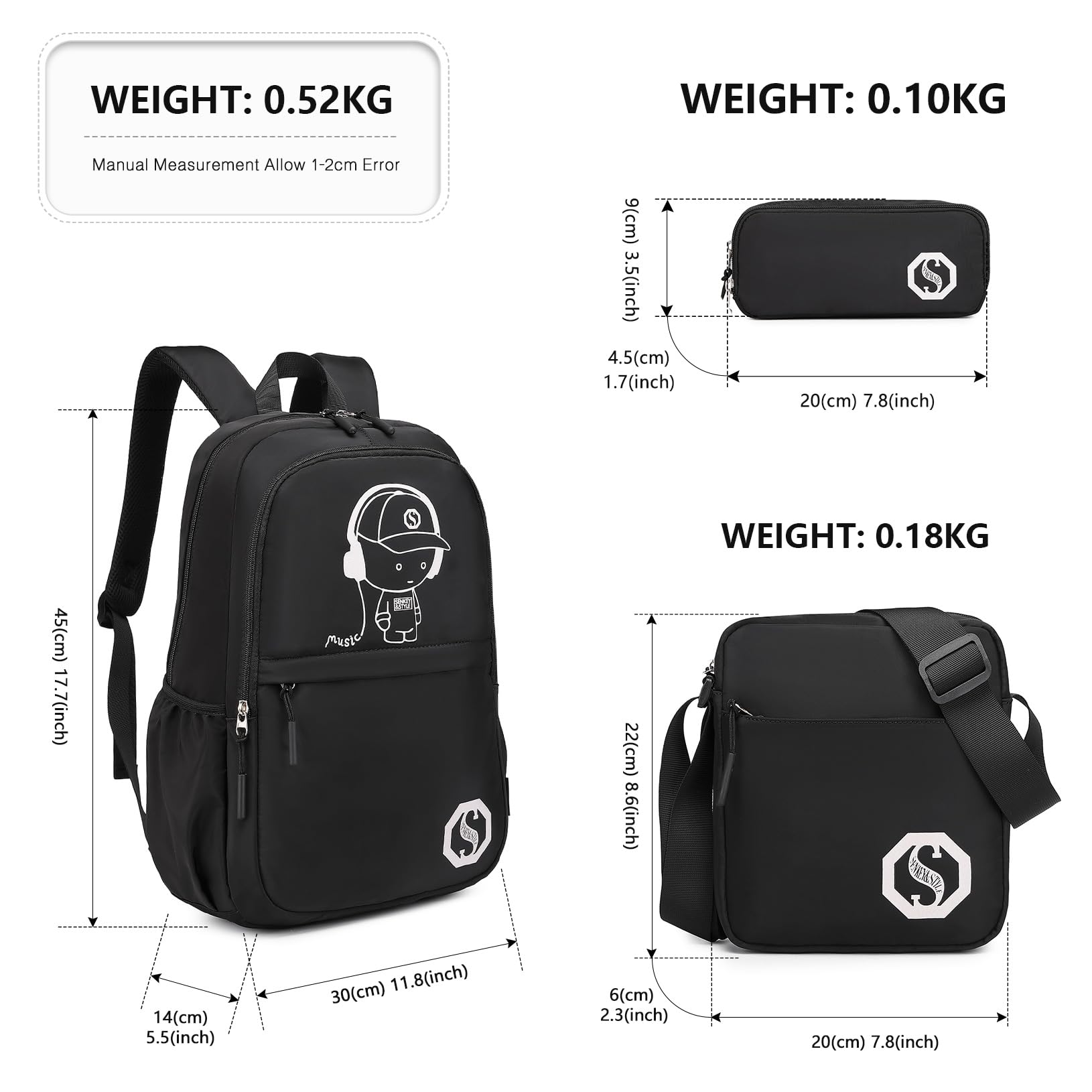 ["Complete Glow Backpack Set": Enhance your school supplies with our 3-in-1 glowing school backpack set, consisting of a school backpack (17.7x11.8x5.5 inches), a shoulder bag (8.7x7.9x2.4 inches), and a pencil case (7.9x3.5x1.8 inches). The backpack can fit a 15.6-inch laptop and ensures that all your utensils are neatly organized and within reach.","Durability": Made of durable materials and smooth zippers, this backpack set is designed for longevity. It is ready to withstand daily use and provides reliable storage space and organization for all your school needs in one convenient package.","Innovative Glow-in-the-Dark Design": Equipped with a unique glow effect, this backpack set not only stands out during the day but also glows in the dark, providing visibility and safety at night. The high-quality glow material absorbs light during the day and emits a lasting, vibrant glow in the dark, making it the coolest accessory for any student.","Versatile Usability": This multifunctional backpack set meets all your needs, whether for school, travel, or leisure activities. Perfect for elementary and secondary students, it is also suitable for picnics, camping, hiking, and both summer and winter camps.","Ideal Gift Idea": Our versatile school backpack set is an excellent gift for your loved ones. With responsive after-sales support, we are here to solve any issues within 24 hours. Quality and care in one package."]