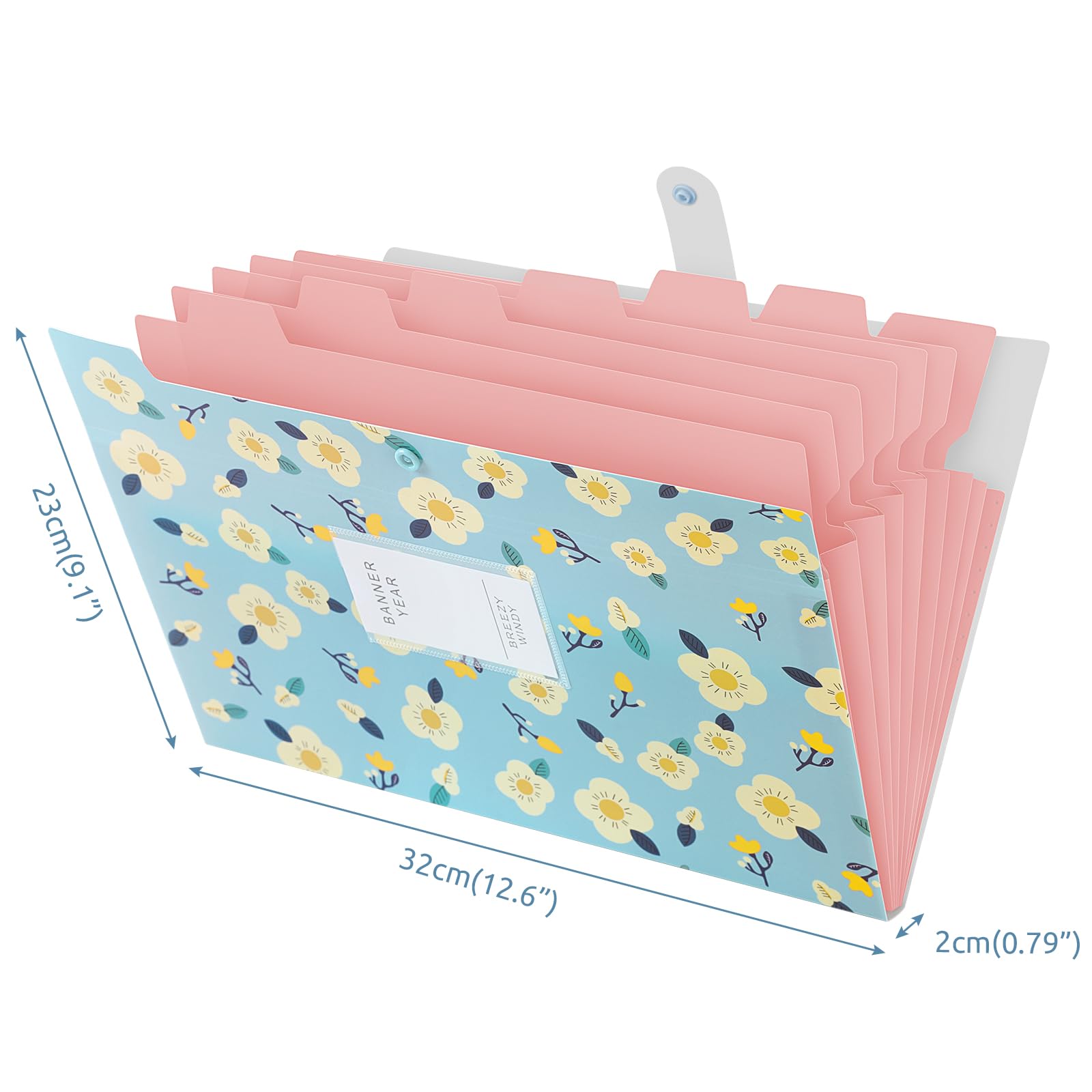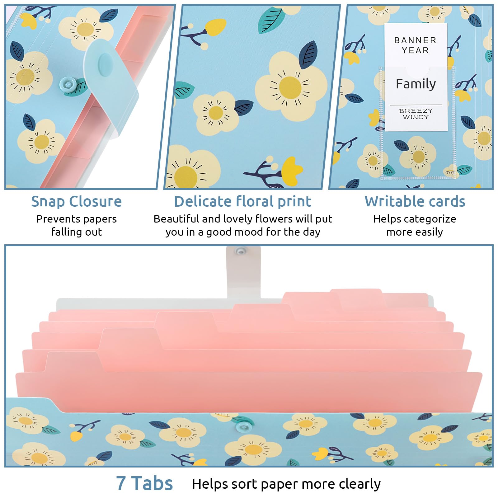 KONVINIT A4 expanding file folder with 7 compartments, floral design. Portable organizer for school, home, work, or office. Comes with labels. Set of 2.