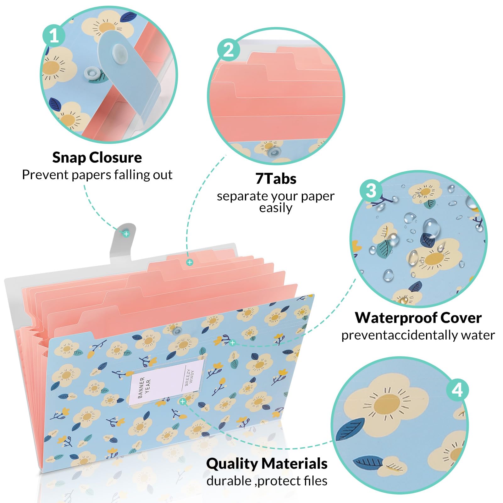 KONVINIT A4 expanding file with 7 compartments. Floral document organizer for home, school, and work trips. Large capacity. Set of 4.