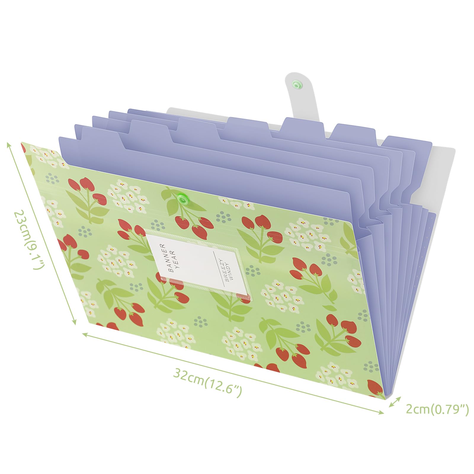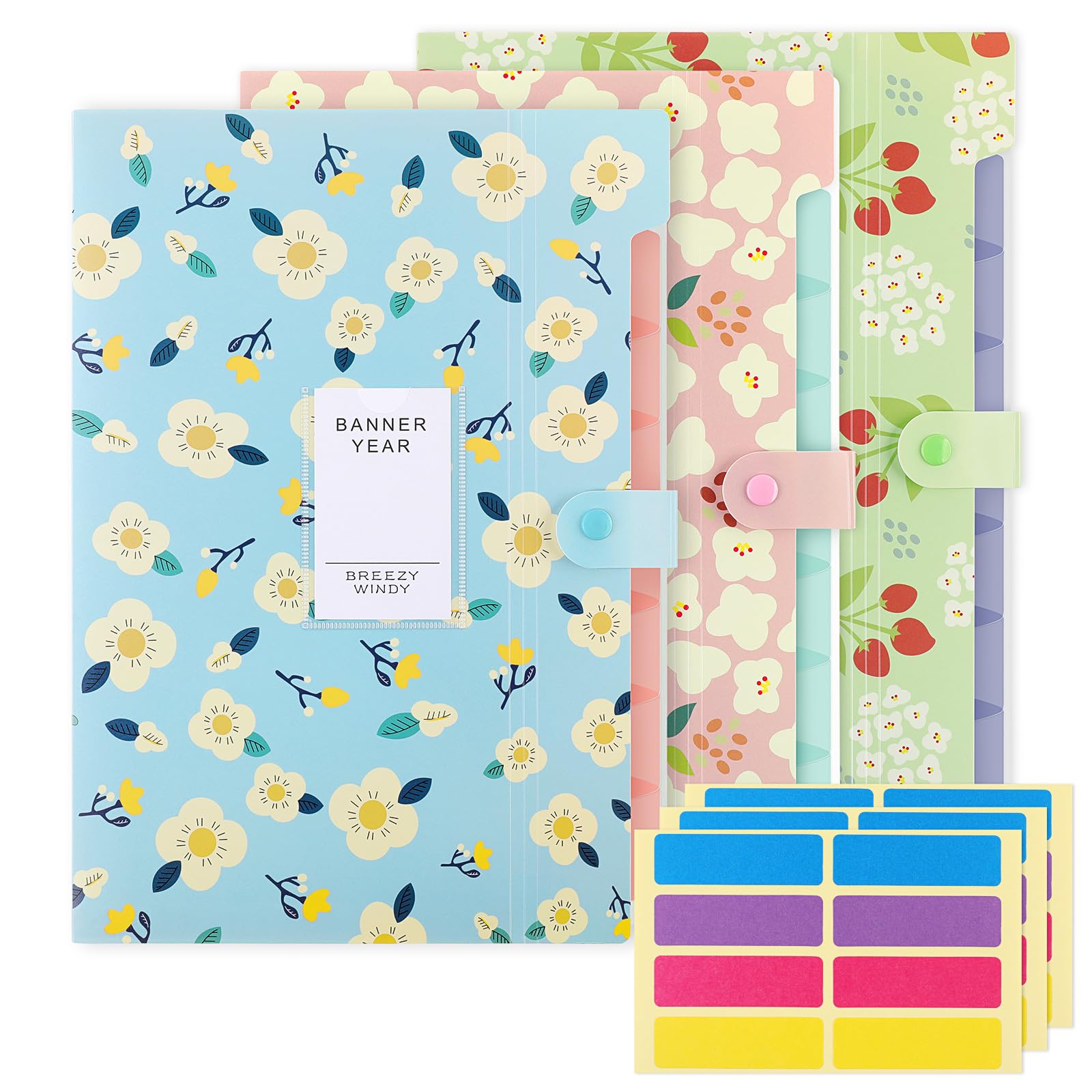 KONVINIT expanding file folder A4 size, document organizer with 7 compartments, portable floral patterned file folder with labels, for school/home/office, pack of 3.