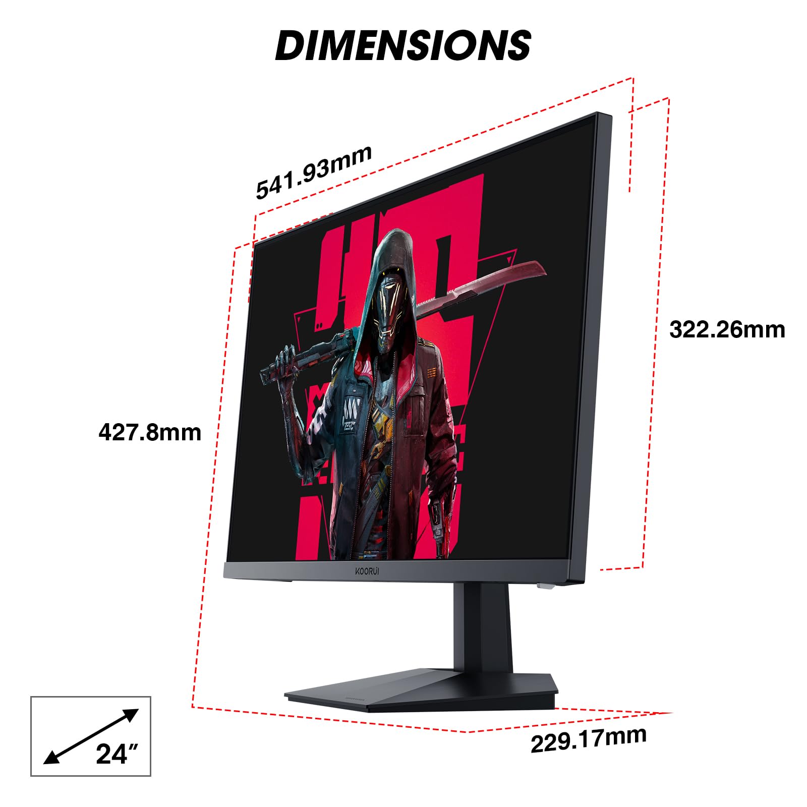 ["Excellent image quality"] The 24 inch gaming monitor from KOORUI has a solid contrast ratio for an IPS panel, so it works well in both dark and bright rooms. The 99% sRGB color gamut allows the gaming monitor to display rich colors and vibrant images. With a wide viewing angle of 178°, you can enjoy the image quality from any angle. The computer monitor with a dynamic contrast ratio of 20,000,000:1 makes the image clearer, sharper, and finer. ["High refresh rate with smooth motion"] The PC monitor with a refresh rate of 165 Hz solves the issue of graphic latency in FPS, racing, and sports games, eliminating blurriness and saying goodbye to graphic delays. The 1 ms Fast LCD GTG response time prevents previous residual shadows from remaining on the screen, reducing edge blur of fast-moving objects and enabling smoother gameplay. ["Flicker-free & Blue light filter"] The 24-inch monitor from KOORUI significantly reduces screen flicker and keeps the image clear and smooth at all times, relieving human eyes from strain and fatigue. The blue light filter function is added to prevent your eyes from getting tired even after long hours of work or gaming. The 1080P PC monitor offers you the most comfortable entertainment experience. ["AMD (Free Sync) technology / N-Card G-Sync support"] The gaming monitor with AMD (Free Sync) technology minimizes input latency and completely eliminates stuttering, blurriness, and tearing during gaming and video playback. The screen is pre-programmed with optimal RTS and FPS display mode values for excellent display quality. ["Ergonomic tilt and VESA compatible"] The KOORUI monitor stand can be quickly installed and disassembled, and also supports VESA stand with 75 x 75 mm. You can choose the best viewing angle by tilting 5 degrees forward and 20 degrees backward.