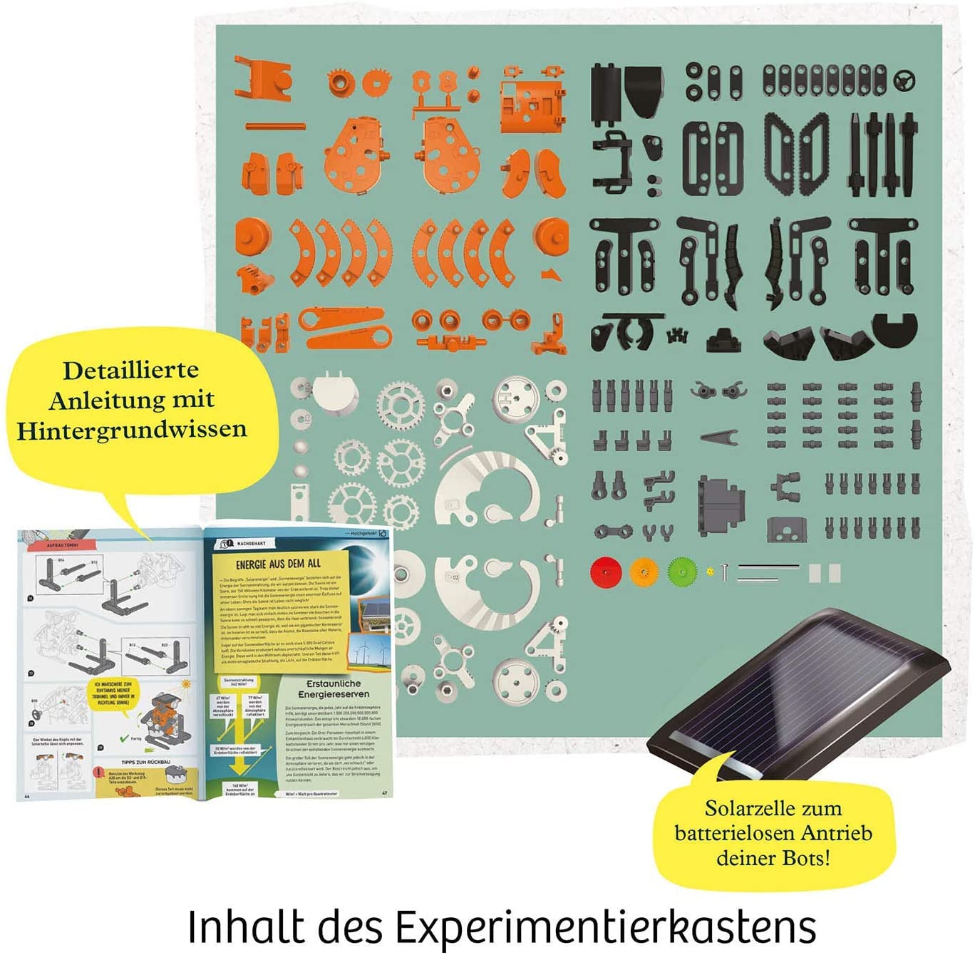 ["Cool action with the power of the sun! Solar bots spin, crawl, walk, or drum around.", "The small, completely emission-free energy bundles can be assembled and rebuilt in 8 different variations.", "Inside the kit, you will find a solar cell and a gearbox, which, when combined with a colorful variety of parts, can be transformed into various little robots.", "The illustrated step-by-step instructions demonstrate how to assemble, disassemble, and rebuild the mini robots, along with exciting additional information.", "With the KOSMOS Solar Bots experiment kit, children aged 8 and above can have fun and gain their first knowledge in physics and technology through action." ]