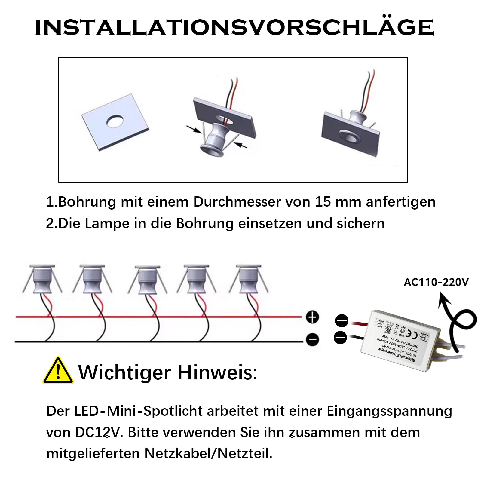 "4. Important notes: The KPSLucerna Mini LED spots have an input voltage of DC 12V. Do not connect directly to AC voltage. Use the included DC 12V transformer to extend the life of the lights.",