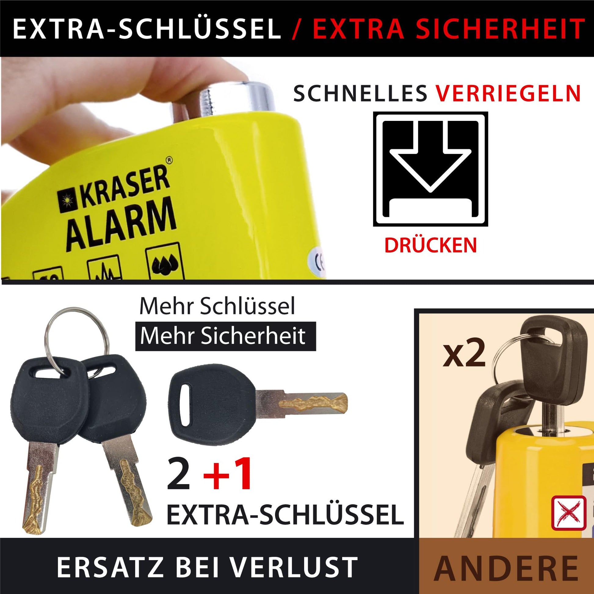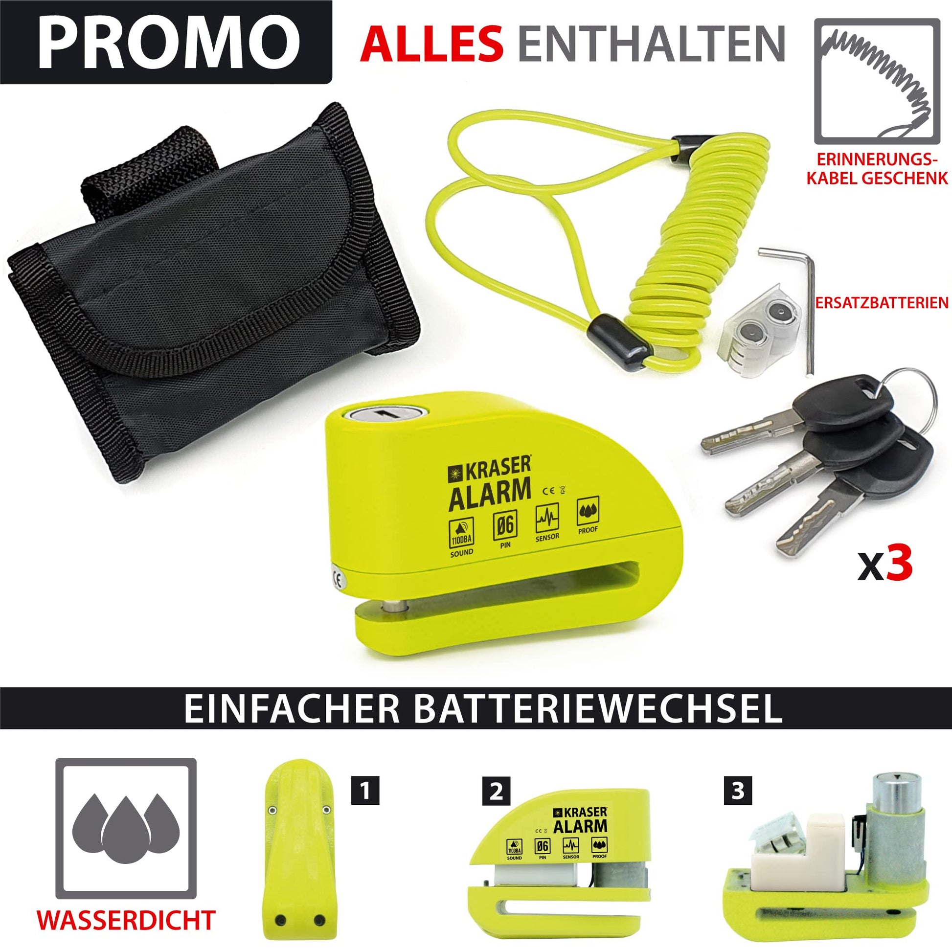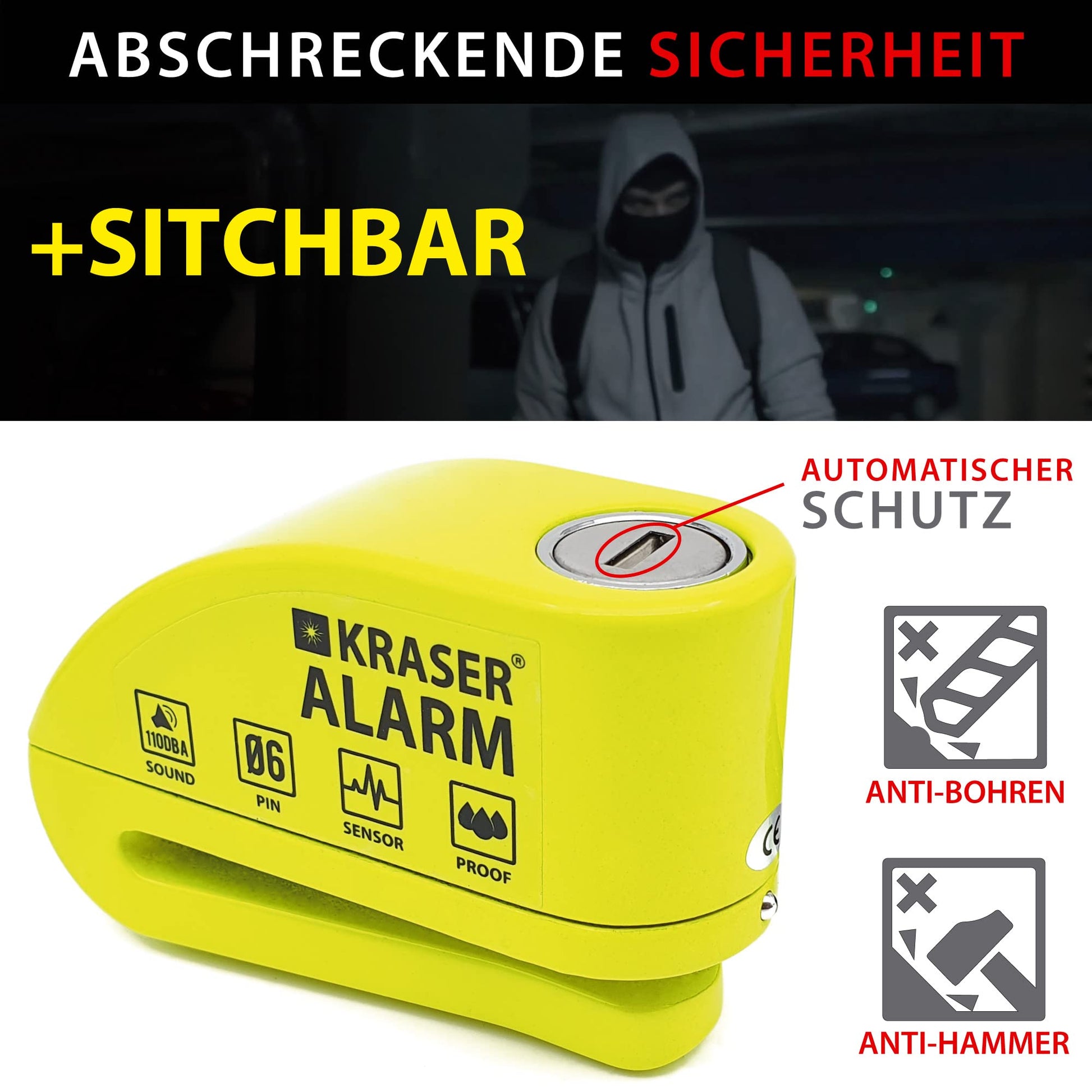 ["PROTECT YOUR MOTORCYCLE WITH THE #1 ANTI-THEFT PROTECTION 2024: Recognized as the best motorcycle security by AUTOBILD. If you're looking for high-quality theft protection at a great price, this disc brake lock with alarm is the perfect solution. With a 6mm thick lock, a powerful 110 dB alarm, and motion sensors, it protects your motorcycle, scooter, or e-bike from any theft attempt.","HIGH-QUALITY MOTORCYCLE LOCK: Don't skimp on the security of your motorcycle. This motorcycle lock with alarm features a shock and rust-resistant casing. The alarm is also waterproof, so you don't have to worry about rain. Enhanced electronics, when motion is detected, give you 3 warning tones enough time to disable it before the strong alarm sounds.","EASY TO USE AND HASSLE-FREE: Tired of complicated security systems that take forever to activate? This motorcycle disc lock with alarm simply locks by pressing the lock. The 6mm shackle fits all motorcycle, scooter, and electric bike disc brakes.","EVERYTHING YOU NEED: This motorcycle theft security set includes everything you need to protect your motorcycle: 3 keys, a reminder cable, a textile bag, a spare battery set, and an Allen key. With this disc lock, you have everything you need to protect your motorcycle!","CHOOSE THE #1 BRAND IN GERMANY TO PROTECT YOUR MOTORCYCLE: The brand KRASER stands for quality, technology, and passion for theft prevention. With this motorcycle disc lock with alarm, you are choosing the best theft protection for your motorcycle. Don't let your motorcycle get stolen, protect your investment with KRASER!"]