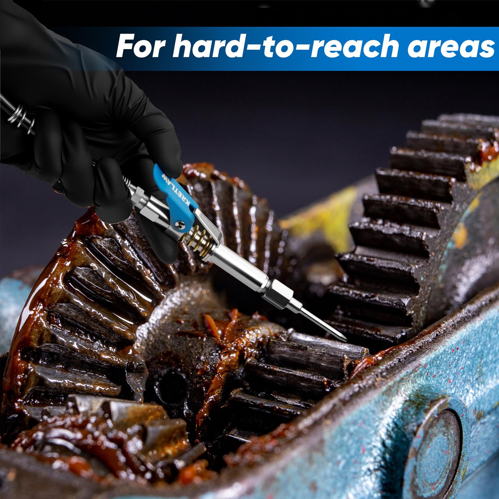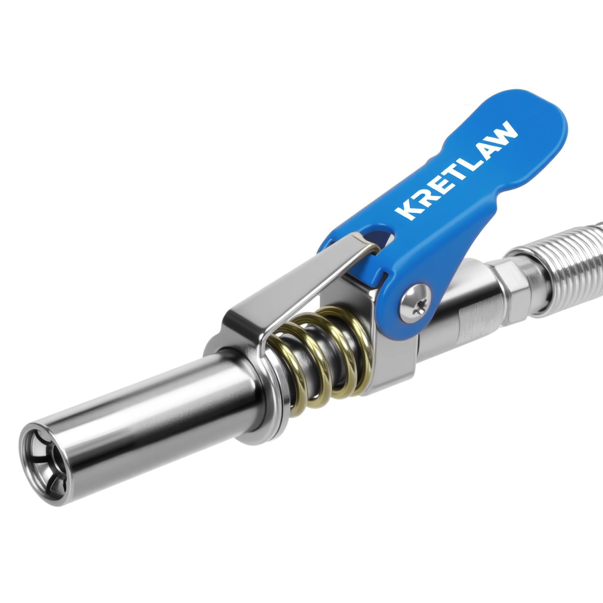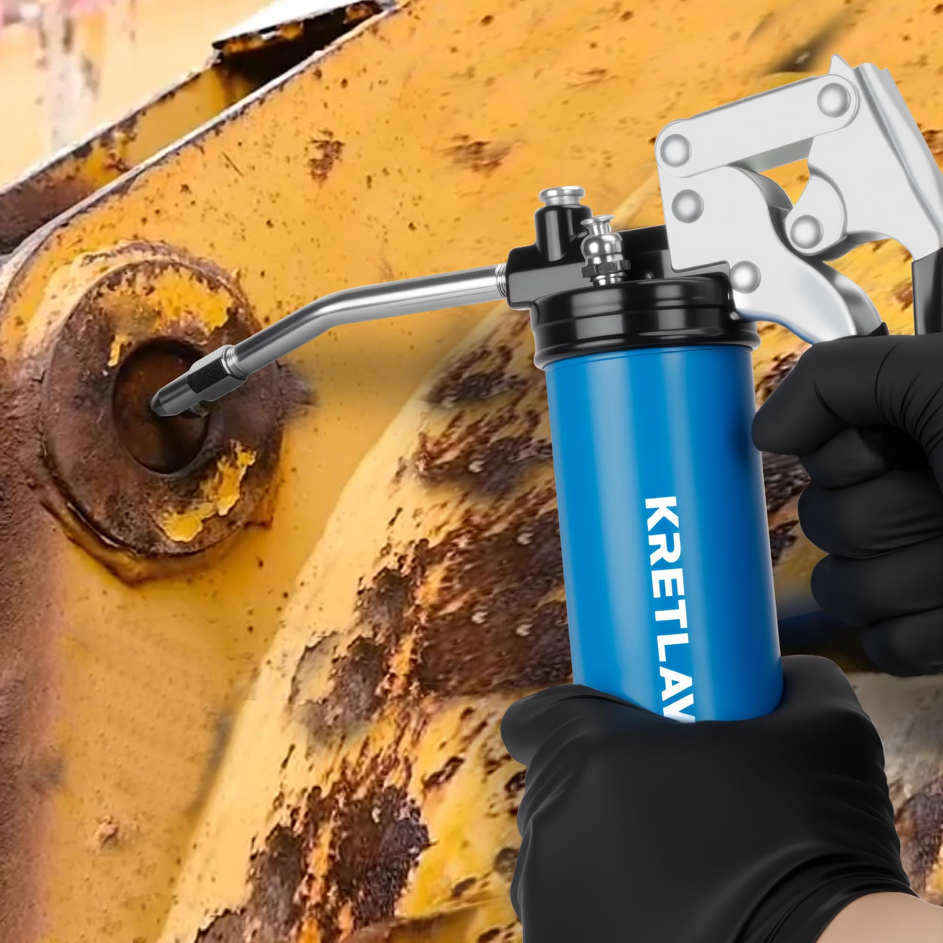 ["IN YOUR GREASE GUN KIT: Consisting of 1 high-performance grease gun, complemented by 1 premium upgrade for 6-jaw coupling, 1 piece 450mm flexible hose and 2 pieces 300mm spring hoses, double universal grease injector for precise lubrication of hard-to-reach equipment, 1 piece 4-jaw coupling, 1 versatile extension tube, 1 precise sharp nozzle and 1 protective glove.","BLEED VALVE: Equipped with a bleed valve, the KRETLAW grease gun effortlessly releases trapped air with just the push of a button. Attention! Always remember to bleed the air before first use.","STURDY GREASE GUN: The pistol grip grease gun features a high-quality, durable aluminum die-cast construction that ensures an impressive maximum working pressure of 7000 PSI and flawless, leak-proof operation.","SMOOTH AND ERGONOMIC: The combination of a sturdy T-handle pull rod, a powerful spring, and a high-pressure piston O-ring ensures exceptionally smooth grease application.","VERSATILE APPLICATION SCENARIOS: Suitable for most vehicles, tractors, RVs, cars, power take-offs, steering cylinders, universal joints, suspension rods, ball joints, lawn mowers, chassis, and drive shafts."]