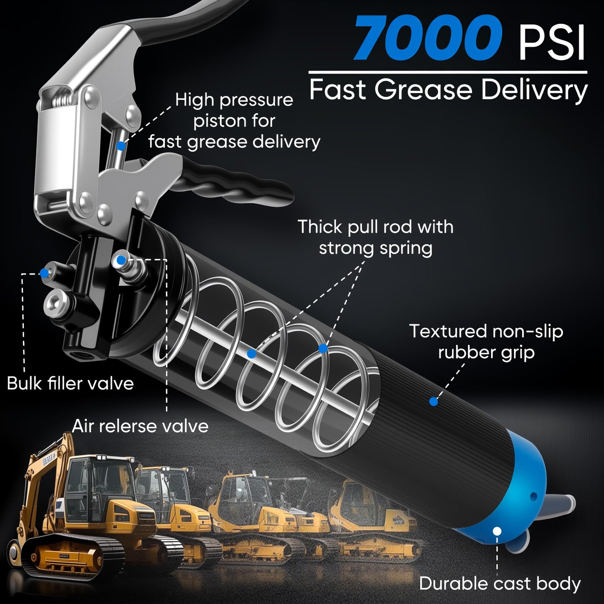 KRETLAW Grease Gun Set 10 Piece, Heavy Duty Grease Gun 7000 PSI with Pistol Grip, Quick Release Coupler and Flexible Hose for 400g Cartridges