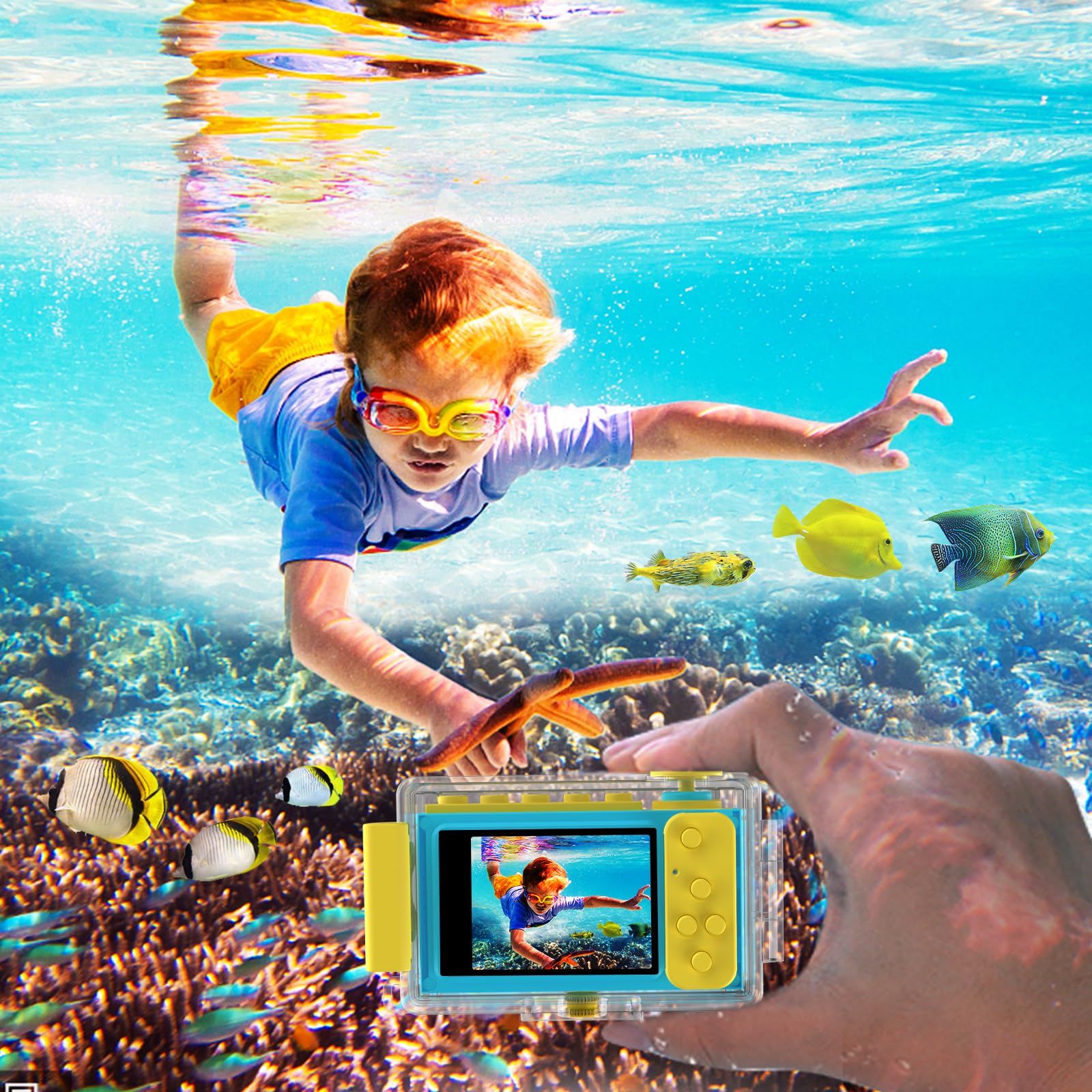 "10 Meter Underwater Kids Camera: Our waterproof camera for kids comes with a waterproof case that is available up to 33 feet underwater, allowing you to capture photos and videos while swimming, skating, cycling, and skateboarding (Note: The camera itself is not waterproof).