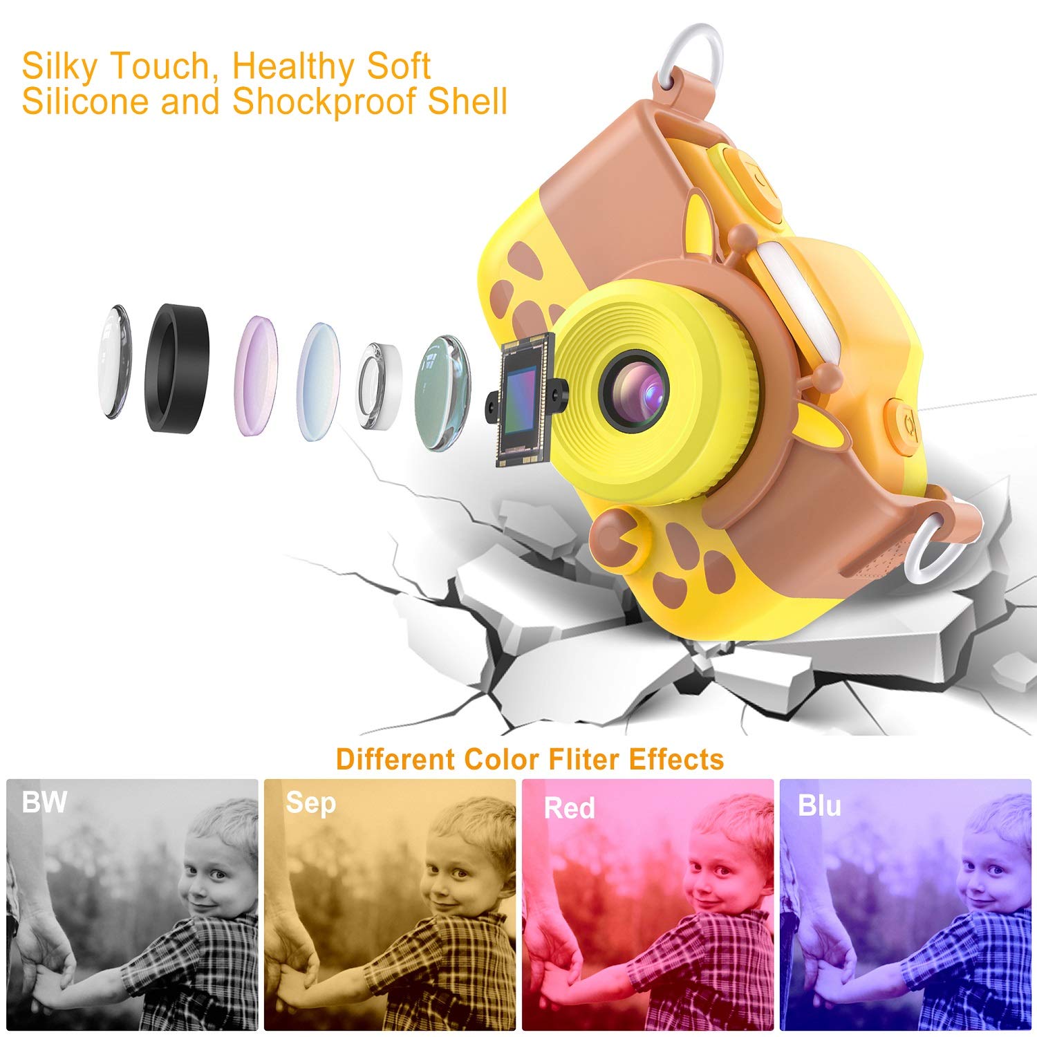 ["Children's camera】This is a newly introduced children's camera with a 2-inch IPS full screen and 16 million pixels. Significantly improve image sharpness and quality.","【Multifunctional】2 in 1 photo camera and video camera, it supports 9x digital zoom, countdown shooting, 3 series shooting, 4 color filter effects, and 20 cartoon photo frames. The maximum support capacity is 32GB (32G TF card included).","【Face recognition and dual lens camera】With the innovative face recognition, front and rear lens camera function, smile capture, and selfies available, you can capture the best moment with your children. Induction flash ensures clear and bright images even in low light conditions.","【USB rechargeable and safety】Built-in rechargeable battery, power charging via USB port and supported 1-minute automatic shutdown extend the battery life. Use non-toxic and environmentally friendly materials to protect children's health. Comes with a silky handle, soft and cute silicone, suitable for small children's hands, easy to carry.","【Best gift and toy】Ideal birthday, holiday, Christmas gift for boys and girls, it stimulates curiosity and imagination, inspires them to discover and capture the most beautiful things."]
