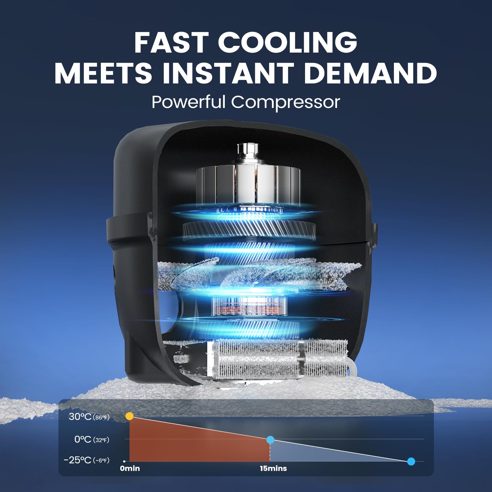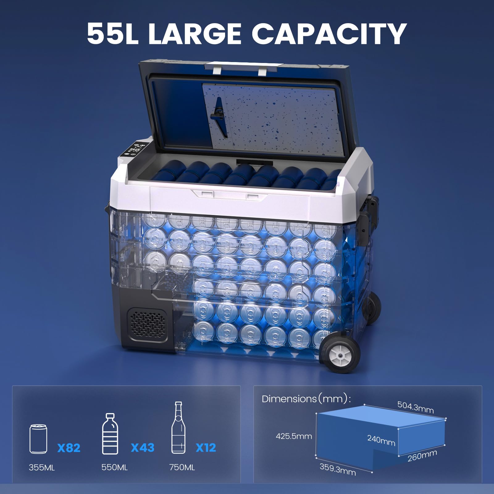 ["【RAPID COOLING ON THE GO】KROAK 55L car cooler box cools to below 0°C in just 15 minutes – perfect for cold drinks after a long day. In MAX mode, it reaches -20°C in less than 4 hours. Whether it's meat, vegetables, or ice cream, everything stays fresh, even on long road trips or camping excursions.","【DUAL ZONE SYSTEM】With the removable partition, you can divide the fridge into two separate zones: one for cooling (e.g. drinks at 5°C) and one for freezing (e.g. meat at -18°C). Removing the partition creates a large 55L space, ideal for larger groceries.","【PORTABLE HANDLE AND WHEELS】KROAK compressor cooler box is equipped with a collapsible trolley handle and sturdy wheels – perfect for transport from the car to the campsite. The side handles are non-slip and ergonomically shaped, so you can easily move the fridge over uneven terrain.","【ENERGY EFFICIENT AND VERSATILE】In ECO mode, the fridge consumes only 0.18kWh/day – less than a standard freezer. It can be used in the car (12V/24V DC) as well as at home (100-240V AC). With the included adapter, you can even connect it to solar panels.","【DURABLE AND USER-FRIENDLY DESIGN】Auto fridge is sturdy and durable, suitable for all types of rough environments, such as rough roads and rainy day camping, with built-in LED lights for easy nighttime use, and practical design of the top cup holders. Meanwhile, it has passed our drop test to ensure reliability for long-term use."]