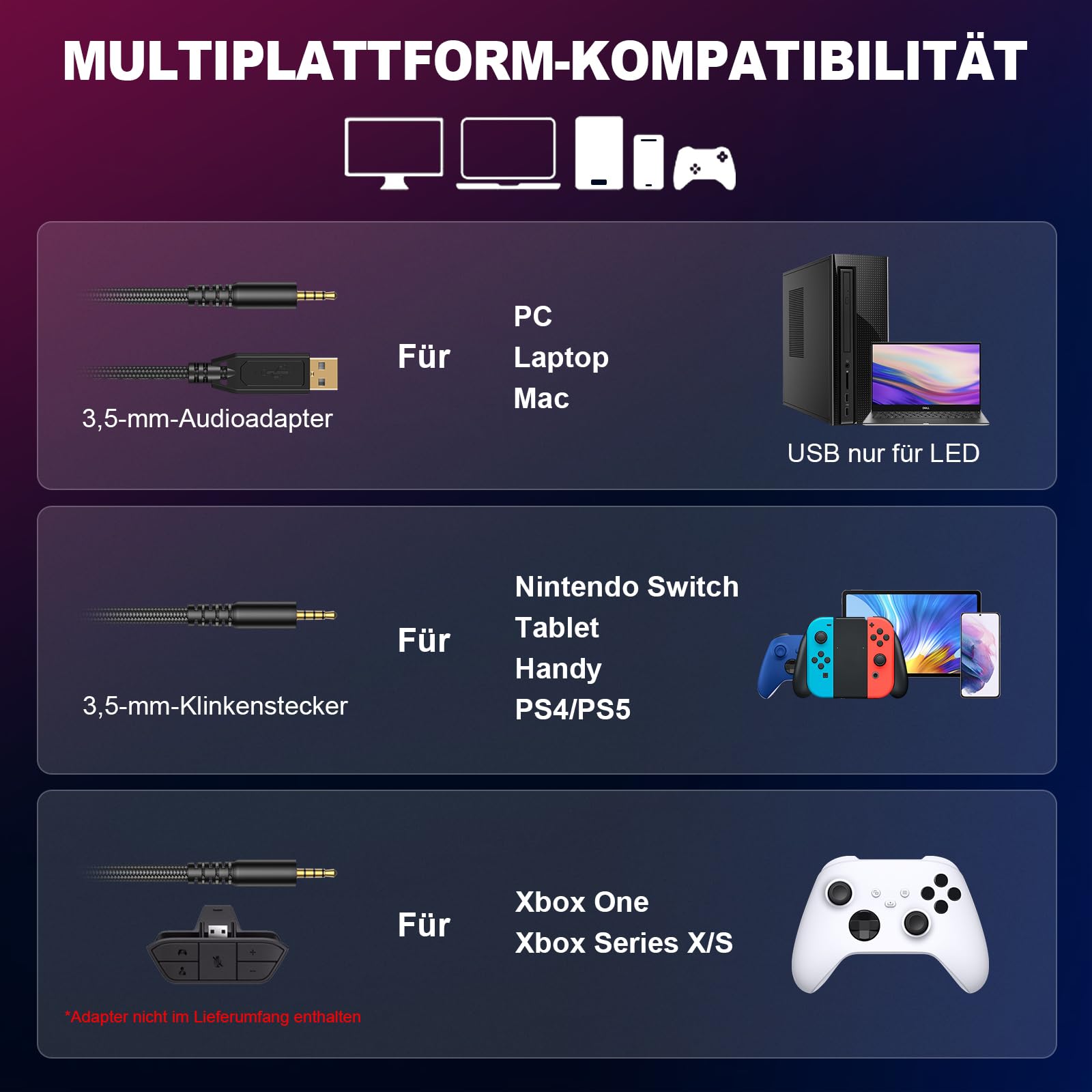 "Multi-platform compatibility: The Krysenix headset with microphone is compatible with PS4, PS5, Xbox One, Switch, PC, laptop, and most other devices with a 3.5mm audio jack.",